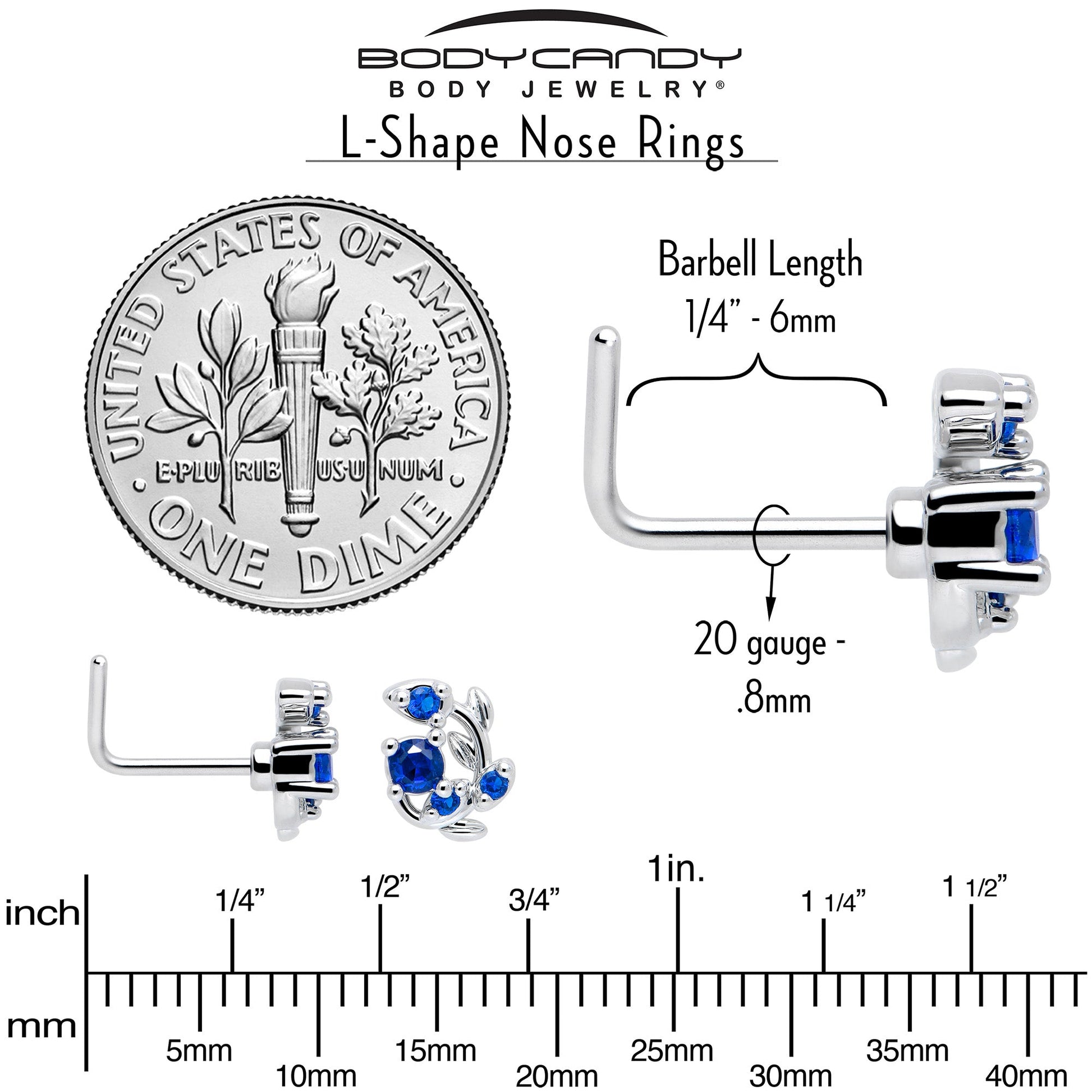 You'll be looking fine when you're rocking the vine on this 20 gauge nostril ring. It's made with a 0.27 inch length at the bend 316L surgical grade stainless steel L-shaped post. It features a leafy vine charm, with the leaves set with deep blue gems for a gorgeous color contrast. It's further embellished with unadorned leaves for added visual impact. This nose piercing jewelry is sure to grow on you.Specifications