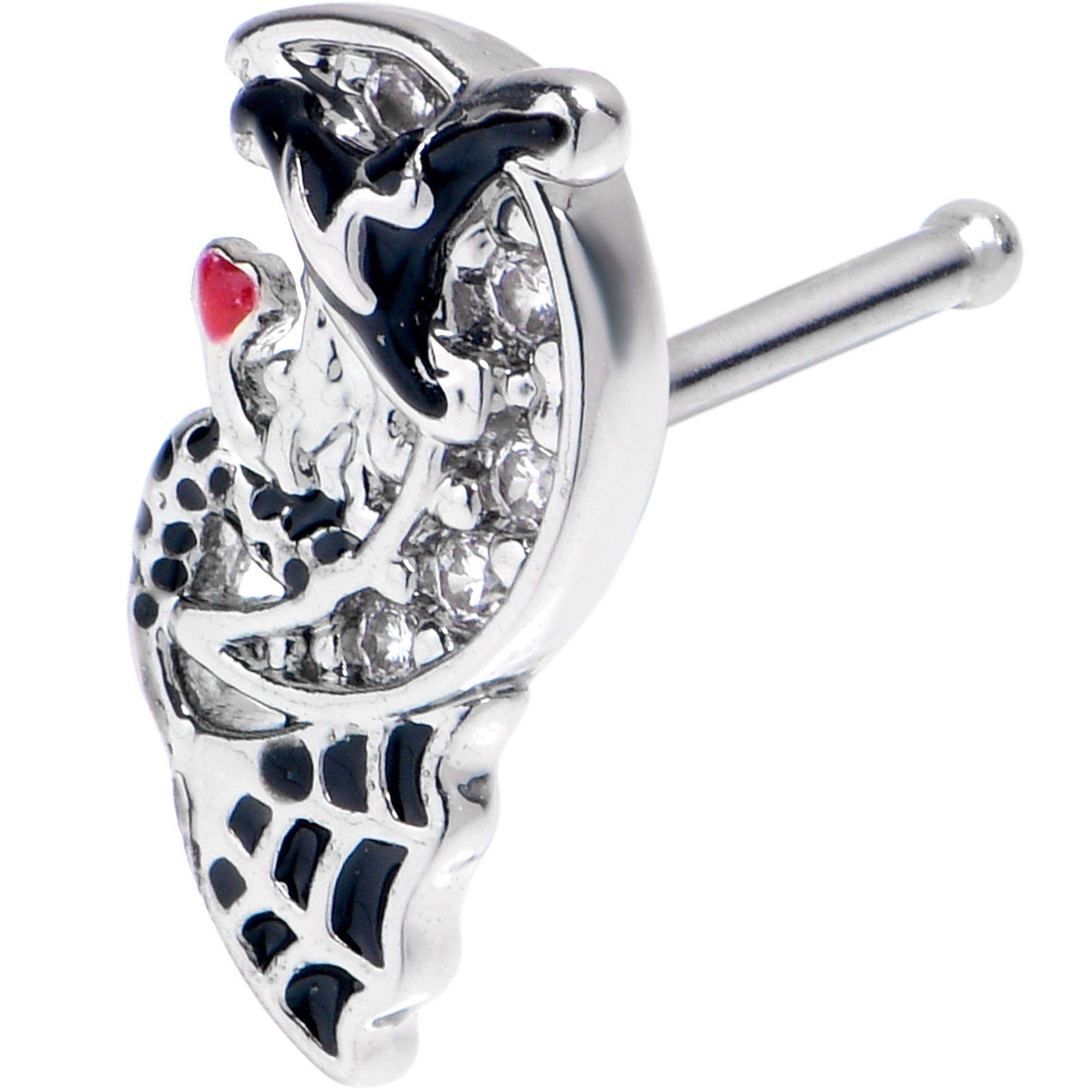 The witch on this 20 gauge nostril ring has found the perfect spot for some stargazing. It is made with a .27 inch 316L surgical grade stainless steel straight post. It features a crescent moon charm, set with textured detail. Sitting on the moon is a witch, with a black detailed hat, spiderweb embellishment on her dress, and a red orb that she appears to be gazing into. You will be seeing stars too with this wonderful witch nose piercing jewelry.Specifications