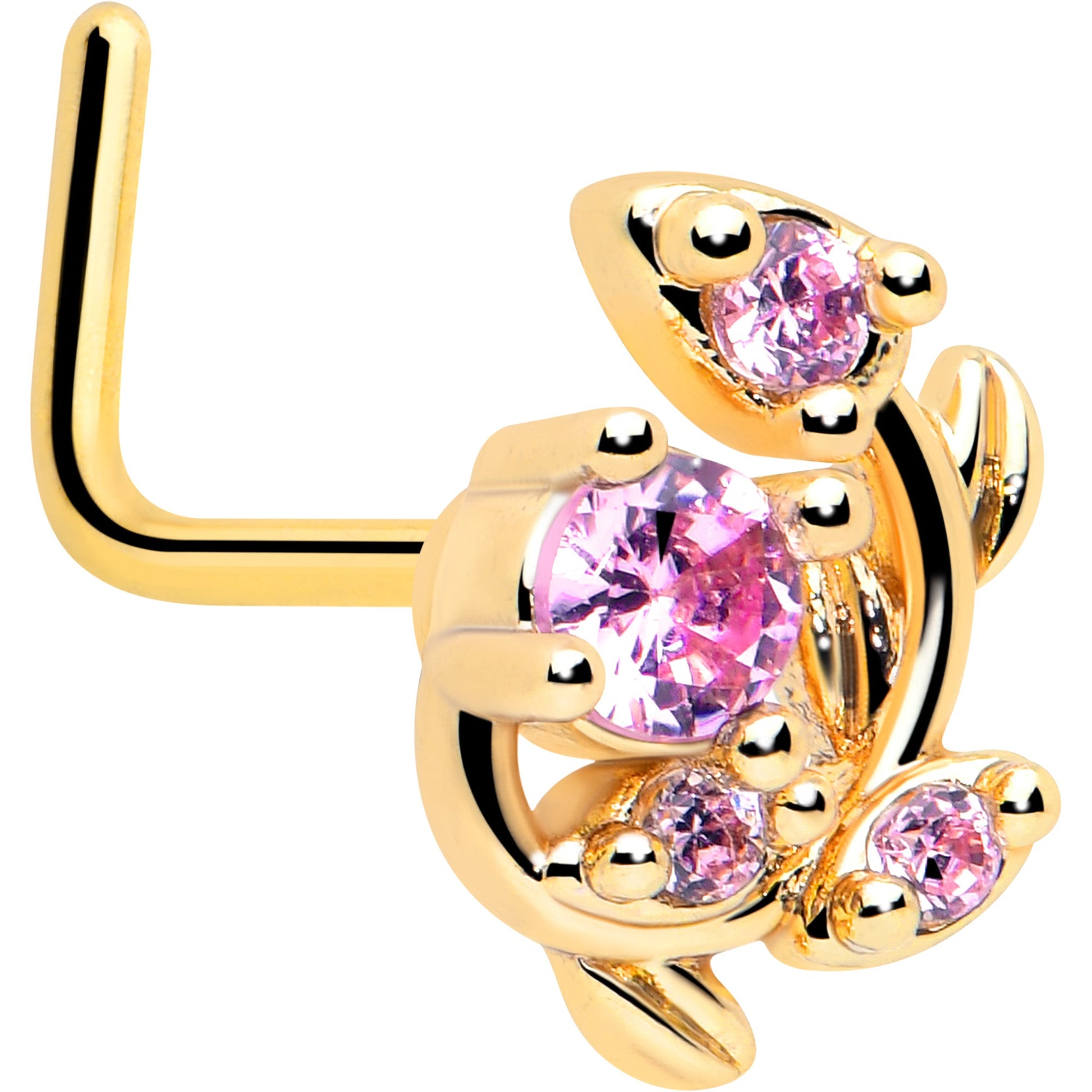 You'll be looking fine when you're rocking the vine on this 20 gauge nostril ring. It's made with a 0.27 inch length at the bend gold tone PVD over 316L surgical grade stainless steel L-shaped post. It features a leafy vine charm, with the leaves set with pink gems for a gorgeous color contrast. It's further embellished with unadorned leaves for added visual impact. This nose piercing jewelry is sure to grow on you.Specifications