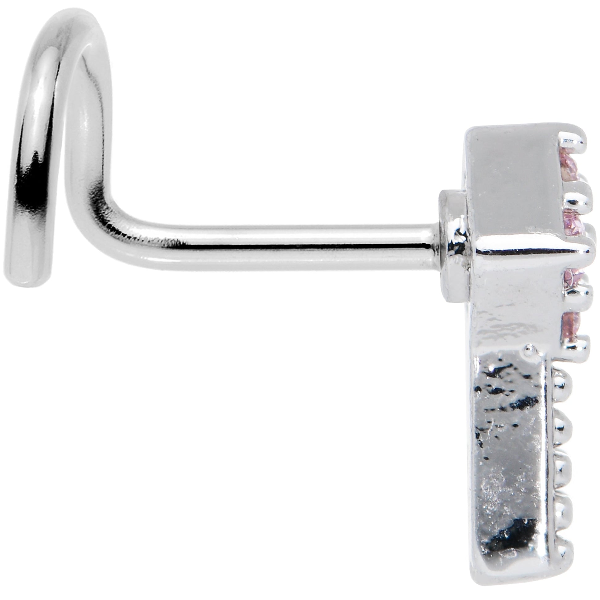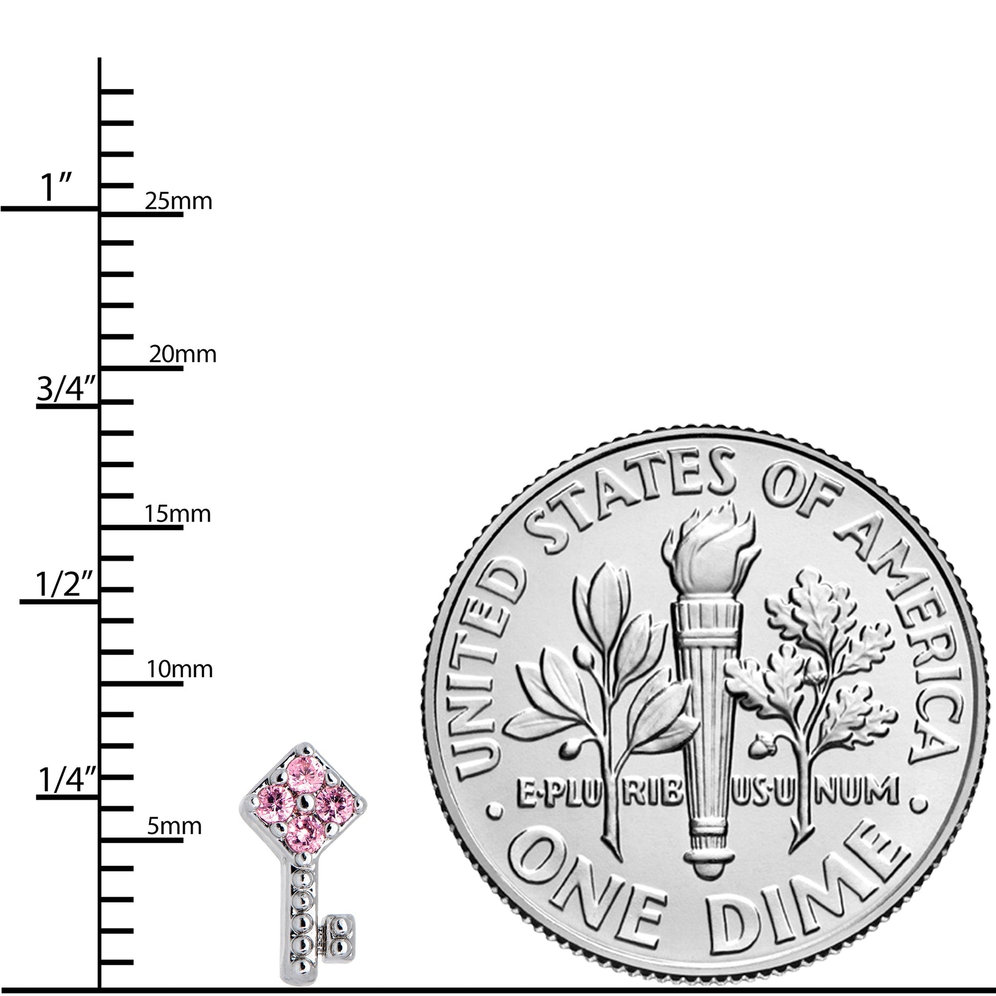 Unlock the key to style with this 20 gauge nostril ring! It's made with a .27" length at the bend 316L surgical grade stainless steel post. It fits a left side nostril piercing and features a key charm, with the blade of the key composed of textured links for an airy appearance. The bow of the key is rhombus shaped and set with pink gems for a pop of colorful glamour that adds a unique style you're sure to love. Let this nose jewelry unlock your heart with this elegant, classic key!