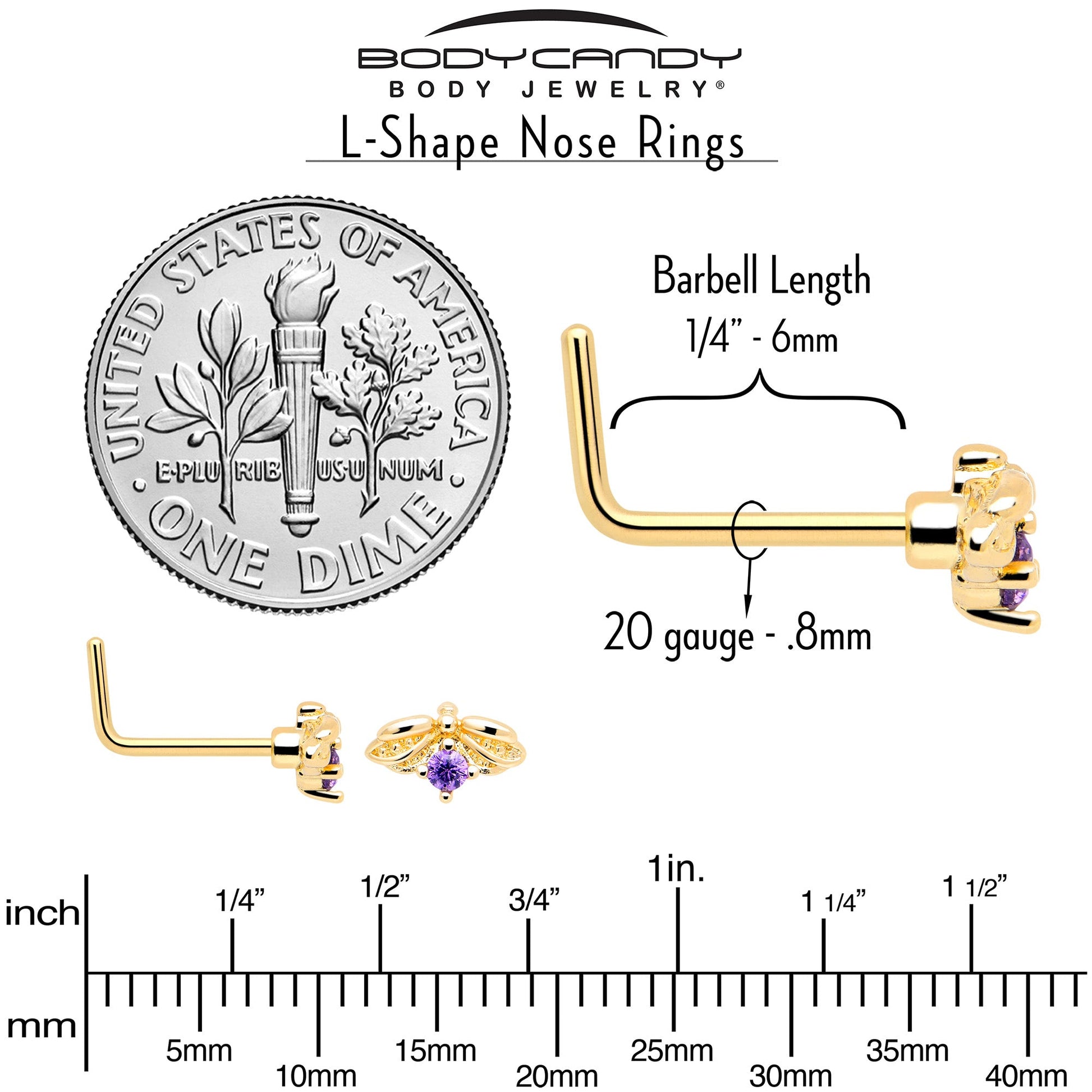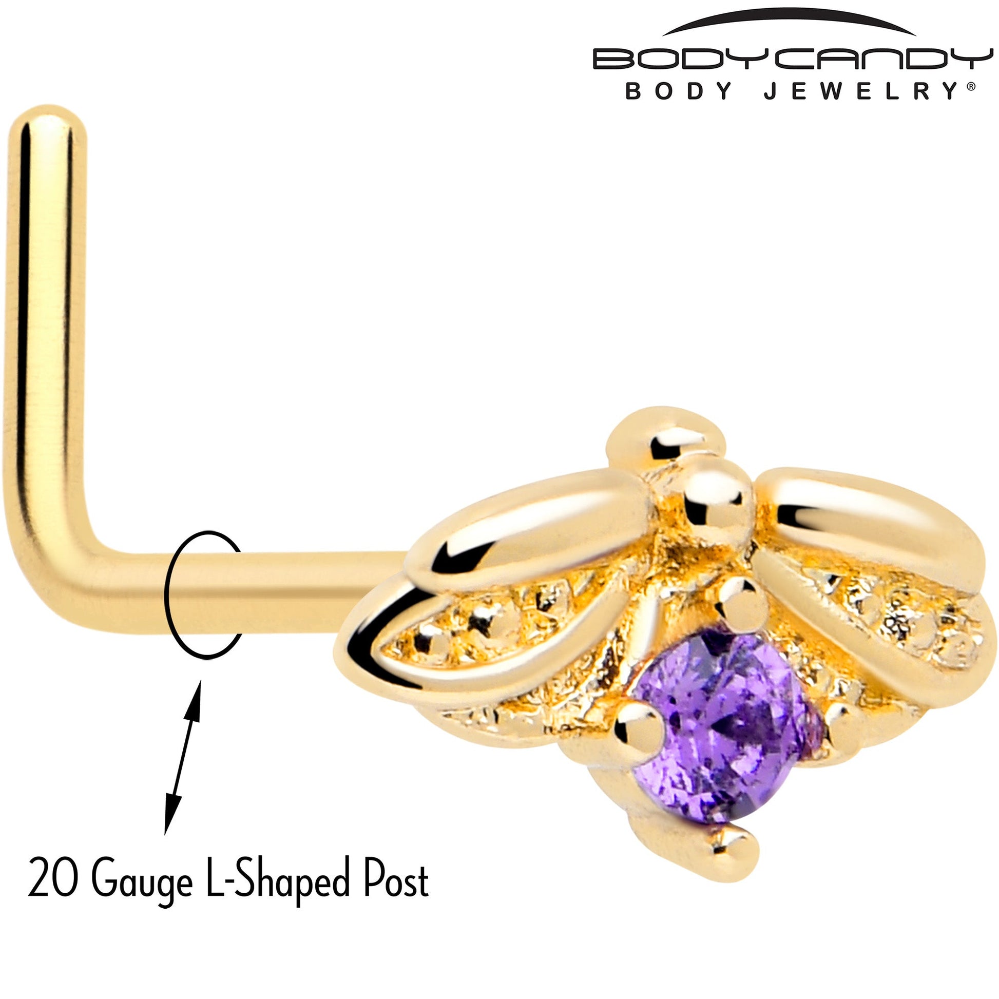 This 20 gauge nostril ring is sure to give you one honey of a new look. It's made with a 0.27 inch length at the bend gold tone PVD over 316L surgical grade stainless steel L-shaped post. It features an insect charm, with the body composed of a single large purple gem. It also features stylized wings for a realistic and airy appearance. This unconventional insect nose piercing jewelry is sure going to make you look super sweet.Specifications