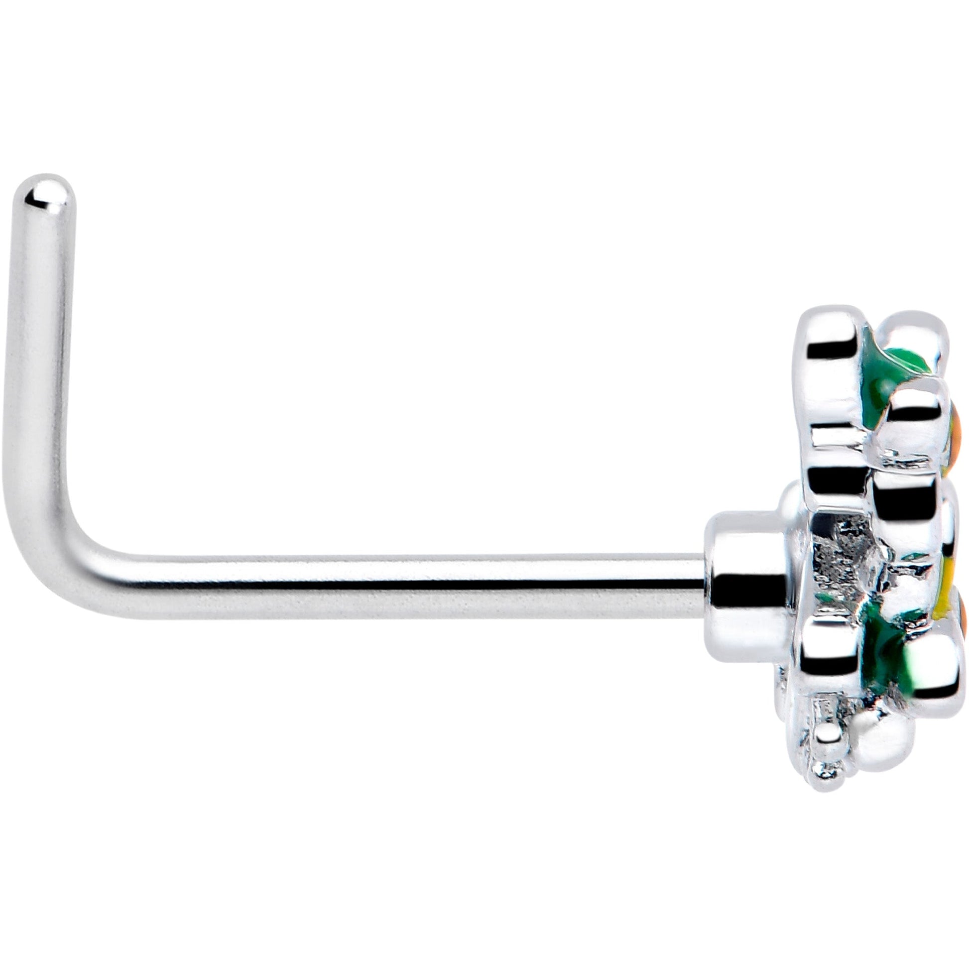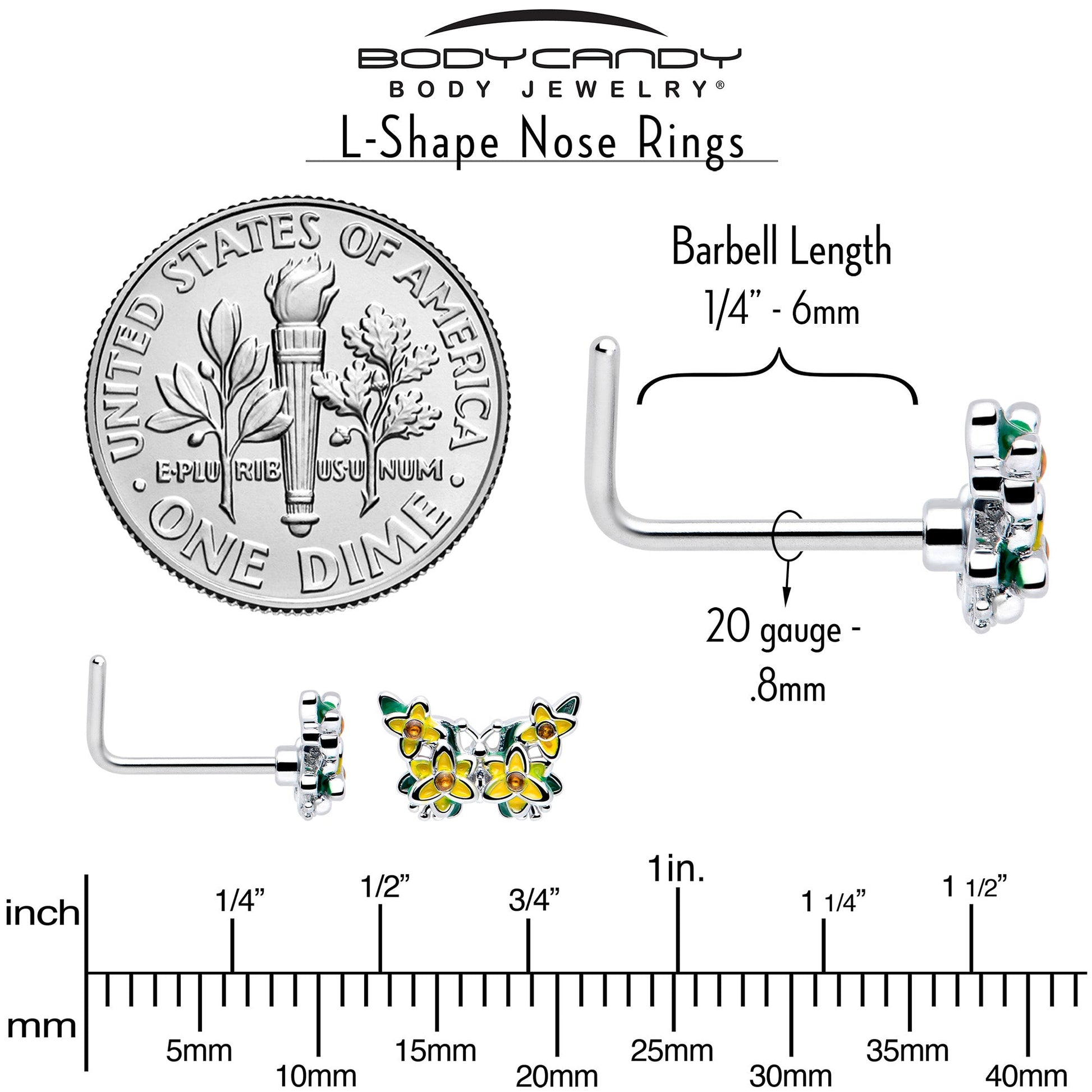 Let your look blossom into something totally new with this 20 gauge nostril ring. It's made with a 0.27 inch length at the bend 316L surgical grade stainless steel L-shaped post. It features a butterfly charm, with the butterfly's wings entirely composed of green leaves and yellow flowers. The flowers are further embellished with yellow cubic zirconia gem centers. Spread your wings and fly into style with this fabulous, floral, butterfly nose piercing jewelry.Specifications