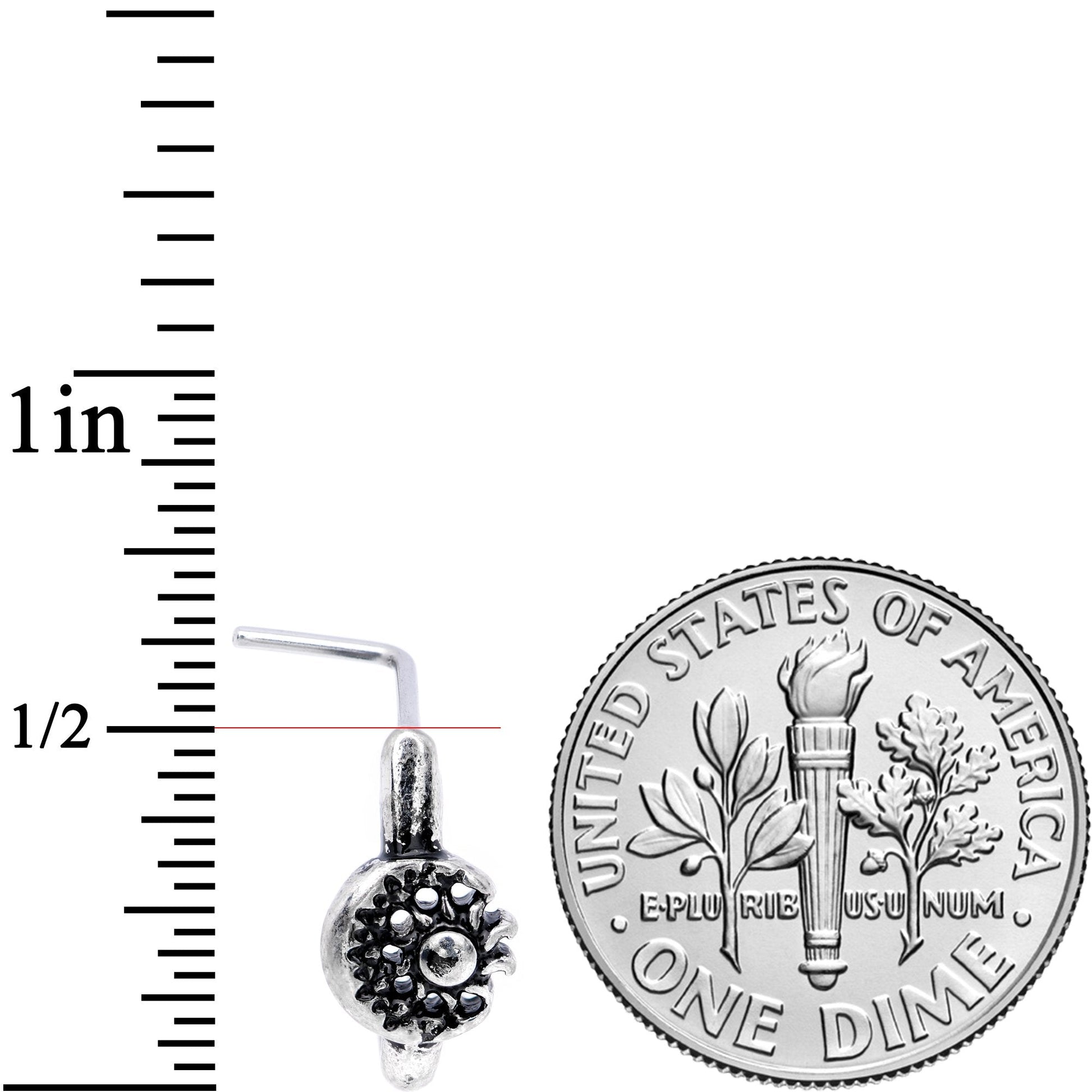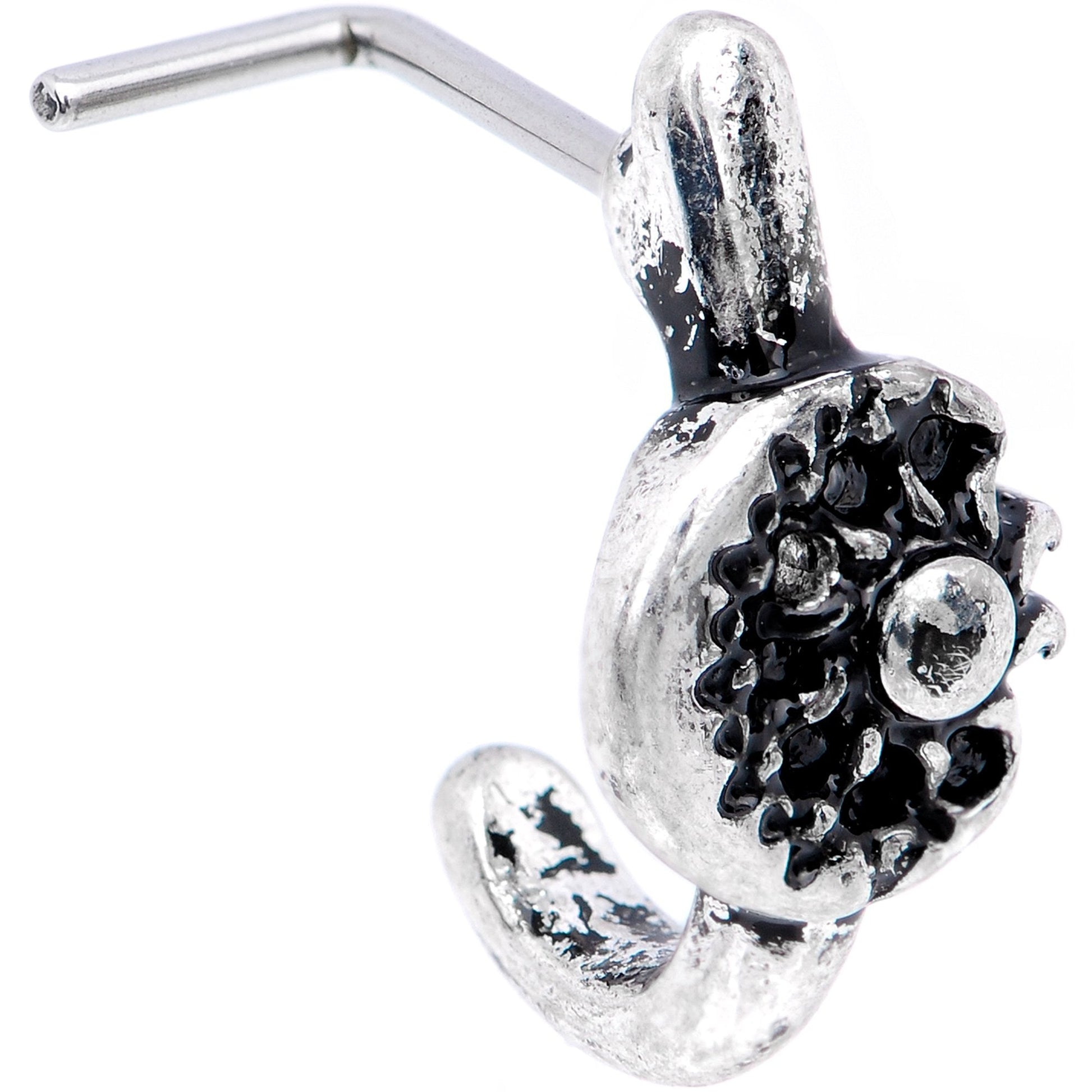 This 20 gauge nose piercing proves that you can have the sun and the moon and still be the star! It's made with a 6mm length at the bend durable 316L surgical grade stainless steel L-shaped post. This nose jewelry gives you the look of a hoop but with the ease and fit of a nostril stud. It features an embellishment of the sun and moon. The sun is embraced on one side by a crescent moon and the piece features black details for further visual interest. So pop this in your piercing and you'll love the way it looks - day or night!Specifications