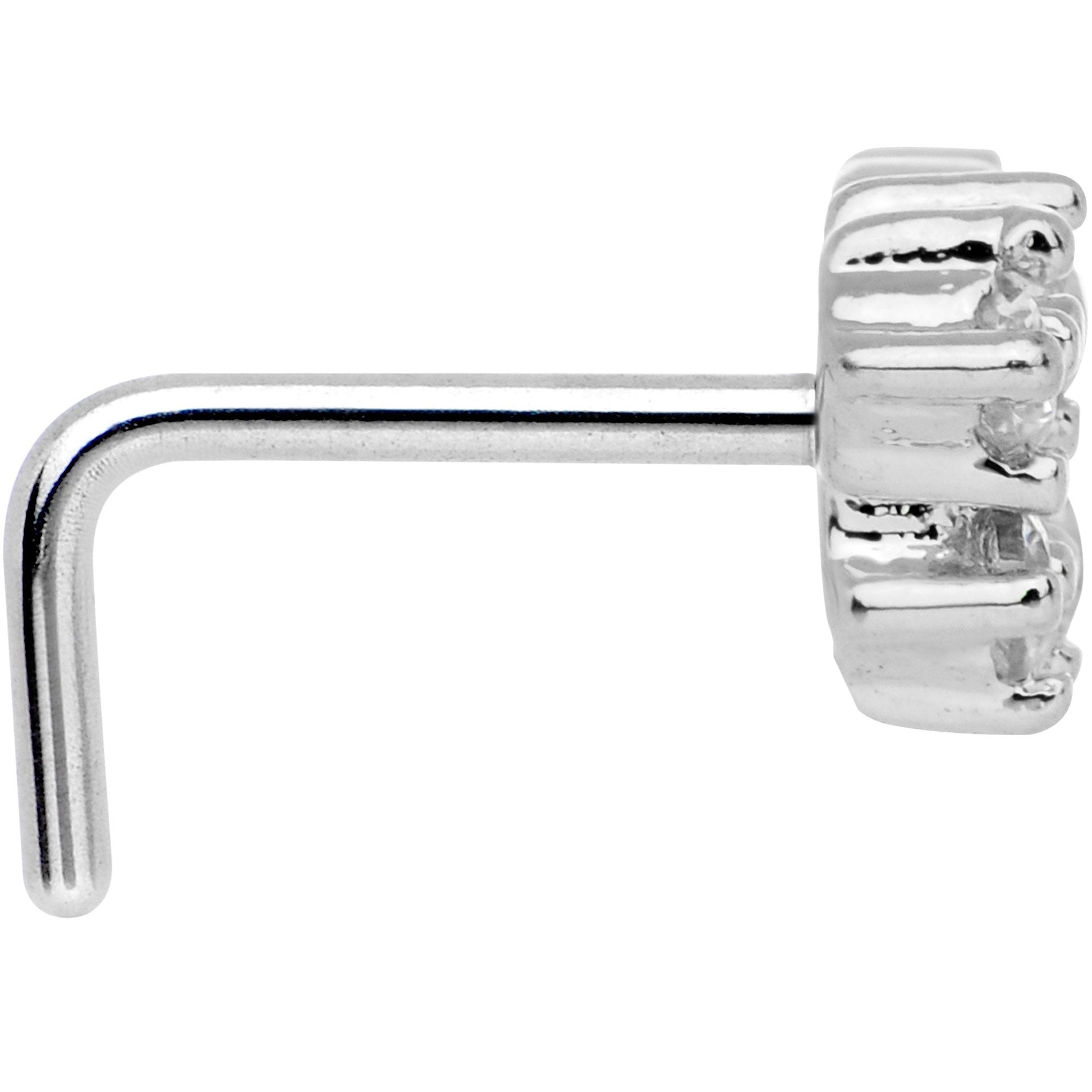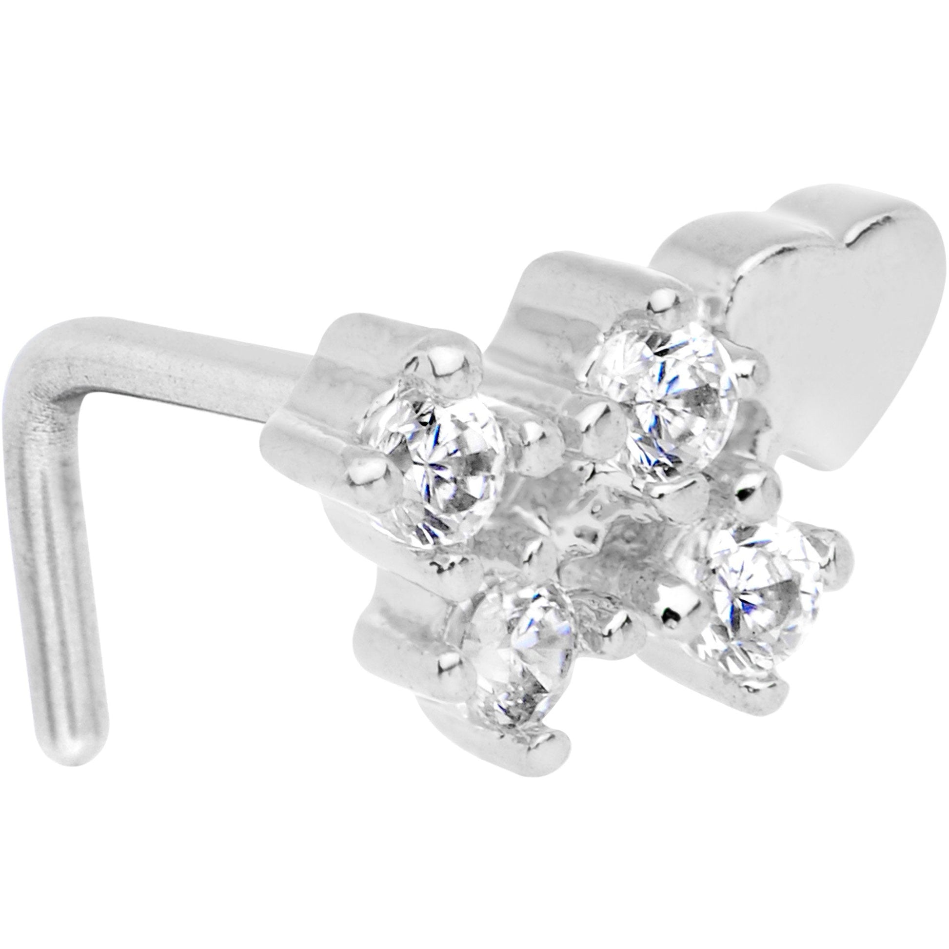 Embrace a lovely look for your nose piercing when you wear this 20 gauge nose ring that looks like a hoop! Made with a 6mm length at the bend durable 316L surgical grade stainless steel L-shaped post, this nostril piercing features a half hoop set with a heart charm and a cluster of clear cubic zirconia gems. This design wraps around the nose and sits outside of your nostril to give the illusion of a hoop in your regular (pierced!) piercing without actually wearing one at all. Try something new; this interesting nose jewelry may be right for you!
