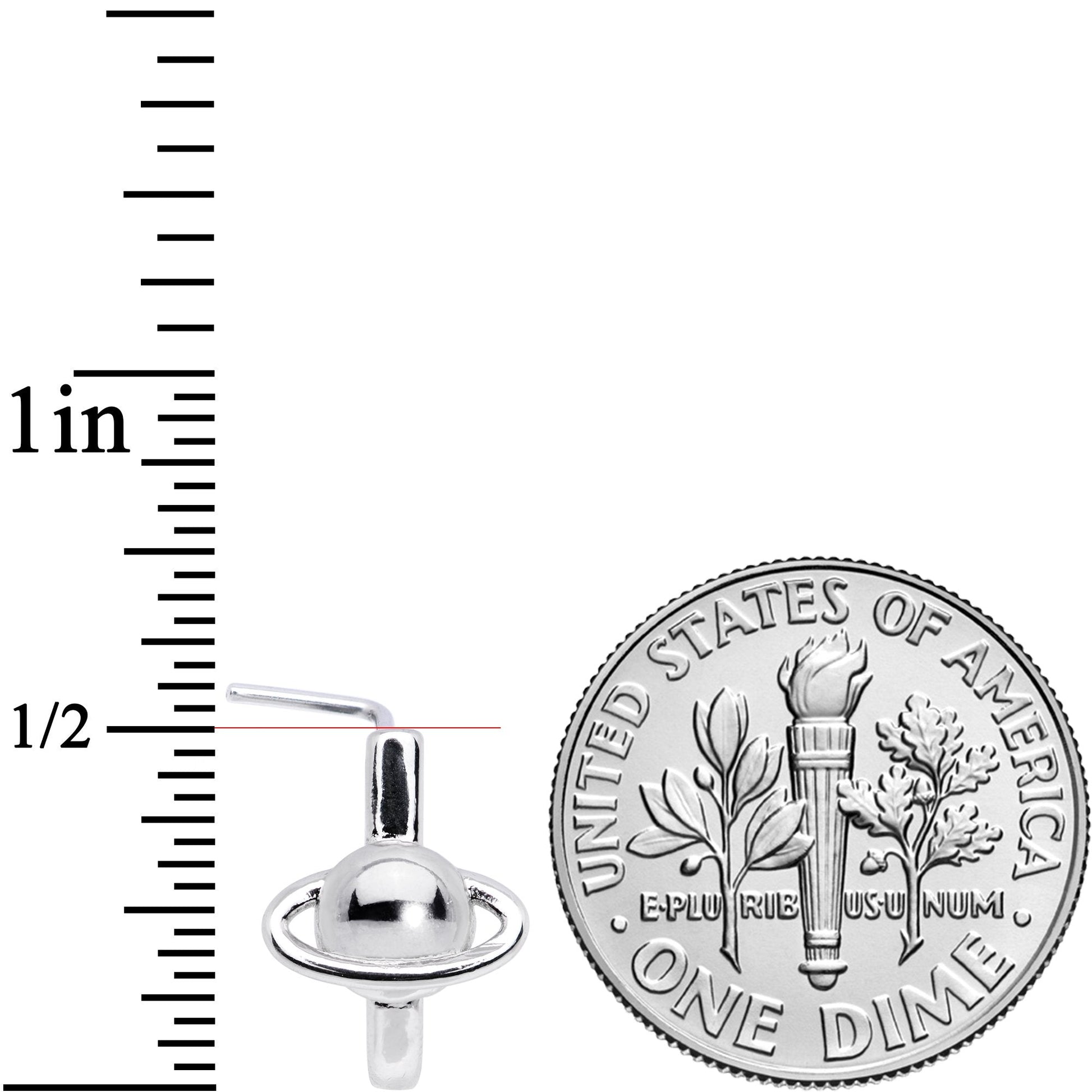 A ring on a ring....it's almost dizzying! This 20 gauge nose piercing features an ornament in the shape of the ringed planet Saturn so if you're feeling a bit spaced out this might be just what you need. It's made with a 6mm length at the bend durable 316L surgical grade stainless steel L-shaped post. This nose ring gives you the look of a hoop but with the ease and fit of a nostril stud. So if your feet are on the Earth but your head is among the stars, grab one of these and let everyone know you can run rings around them!Specifications