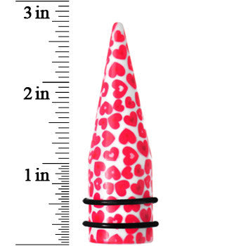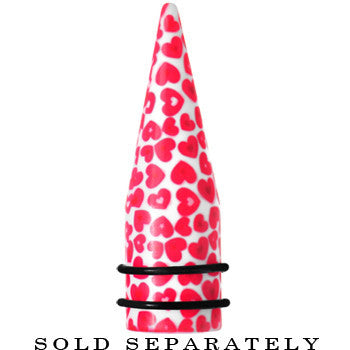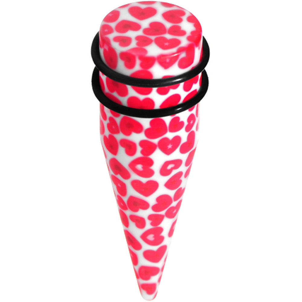 Hypoallergenic jewelry for sensitive skin.20mm ear taper. This white acrylic ear plug features multiple red hearts. Heart ear expander featuring two rubber o-rings. Body piercing ear taper sold individually.