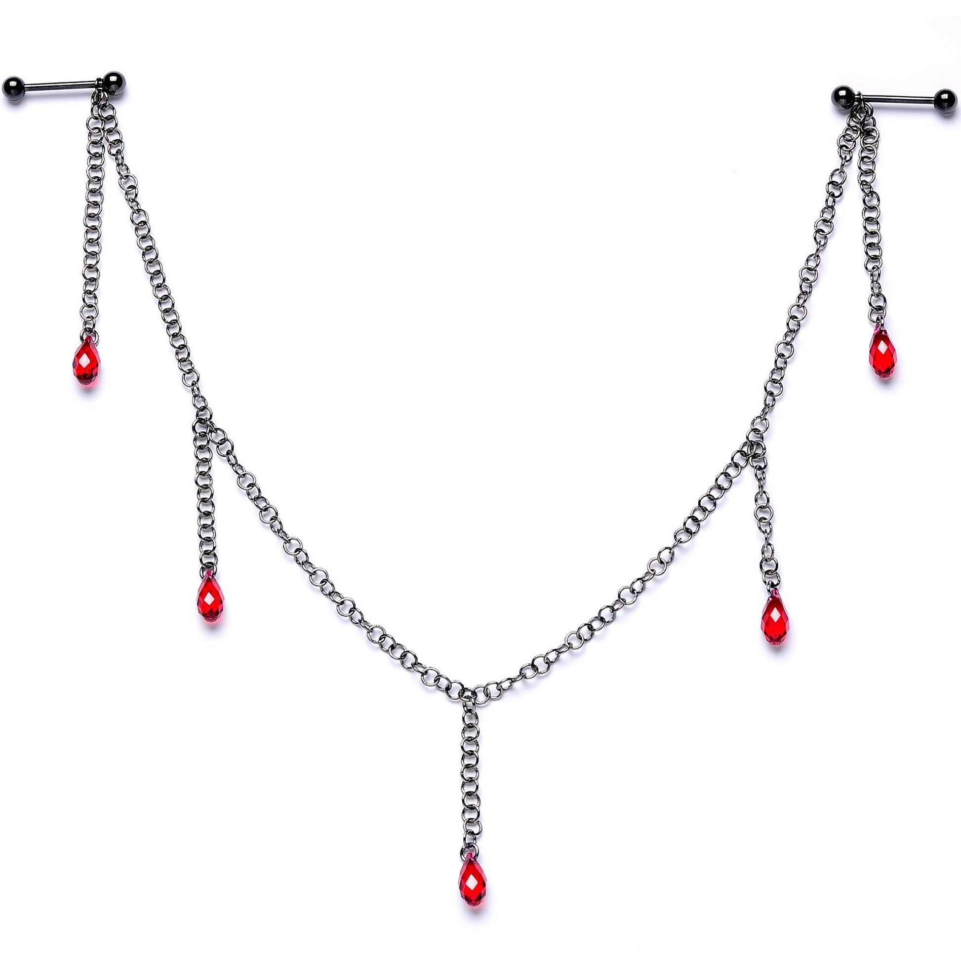 In order to induce the dramatic fashions of gothic style, chain dangle nipple jewelry kissed by a vampire is absolutely necessary. This pair of 14 gauge nipple barbells is made with black titanium ion plated over 316L surgical grade stainless steel and is connected by a 12" black anodized chain strung with chain and red crystal dangles that are reminiscent of the vampire's deadly kiss. This Halloween nipple jewelry is handcrafted in the USA and created with crystals for a creepy aesthetic that will leave your breasts looking magnificent.Specifications