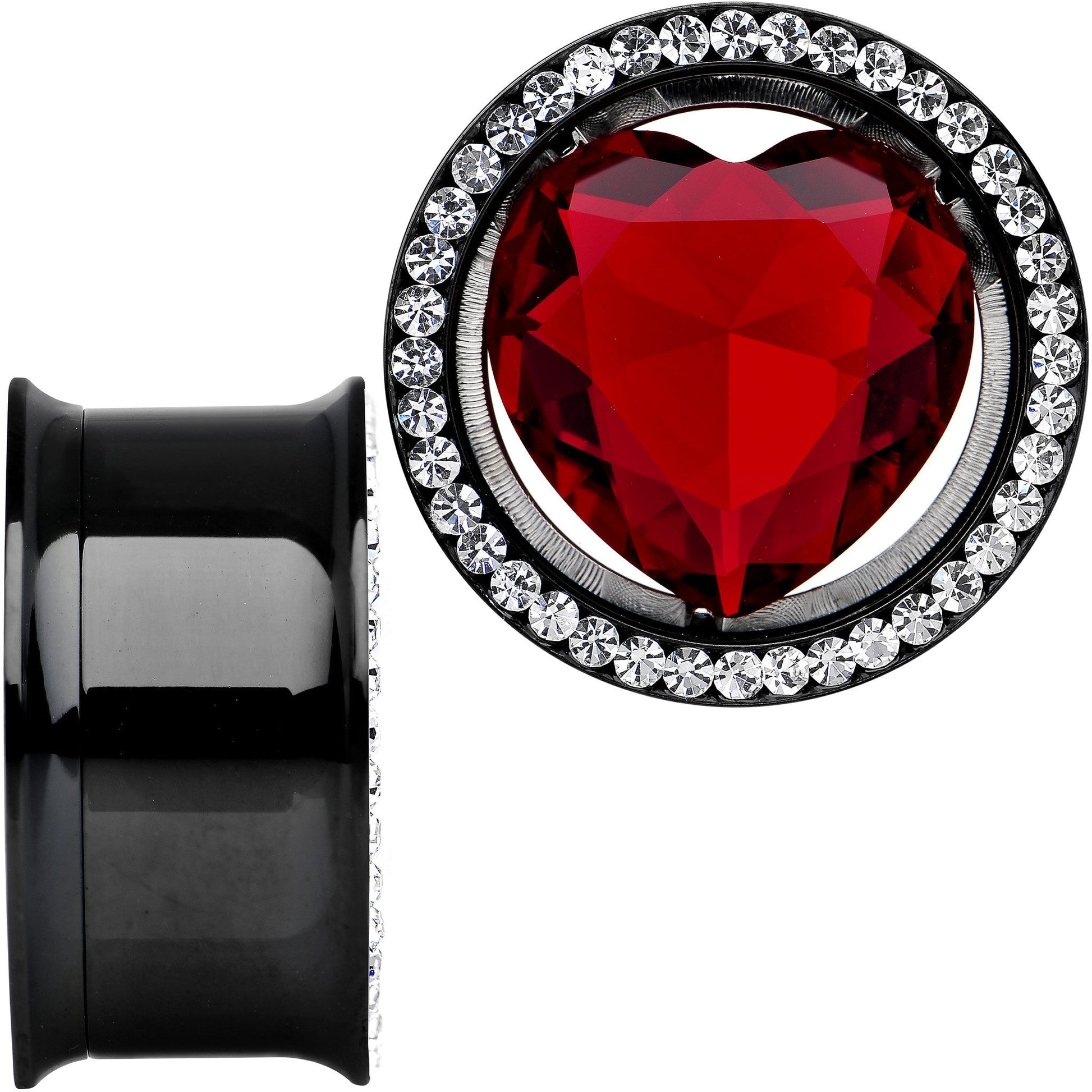 This 7/8" anodized titanium black screw fit double flare plug featuring red heart inserts encircled by clear gems is a must-have for any plug jewelry wearer who is looking for something that adds a touch of feminine style. Anodized with lightweight titanium, this gauge set is ideal for individuals with nickel sensitivity and is internally threaded for easy insertion. These plugs are sold in sets of two.