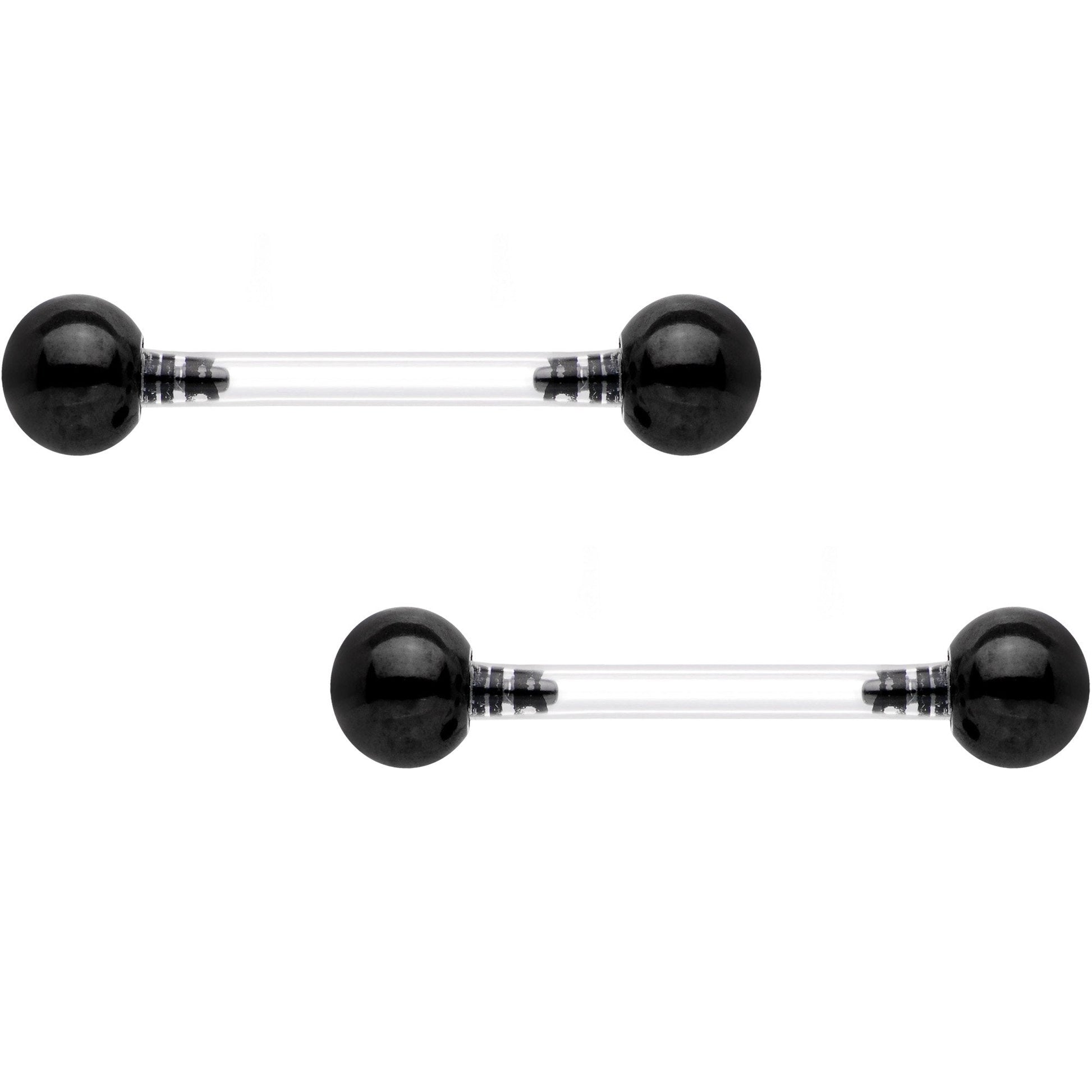 Whether you're looking for a more discrete look or you just want to up your piercing comfort level, you're all set with this pair of 14 gauge barbell nipple rings with eye-catching black ball ends that will always have your nipple piercings looking on point! The 14mm length straight barbell used in this set of nipple jewelry is made from safe and flexible clear Bioplast and beautiful black push in ends. Sold as a pair, this set of nipple rings is more than ready to make their way into your pierced nipples for a style that will bring low-maintenance glamour to any situation.