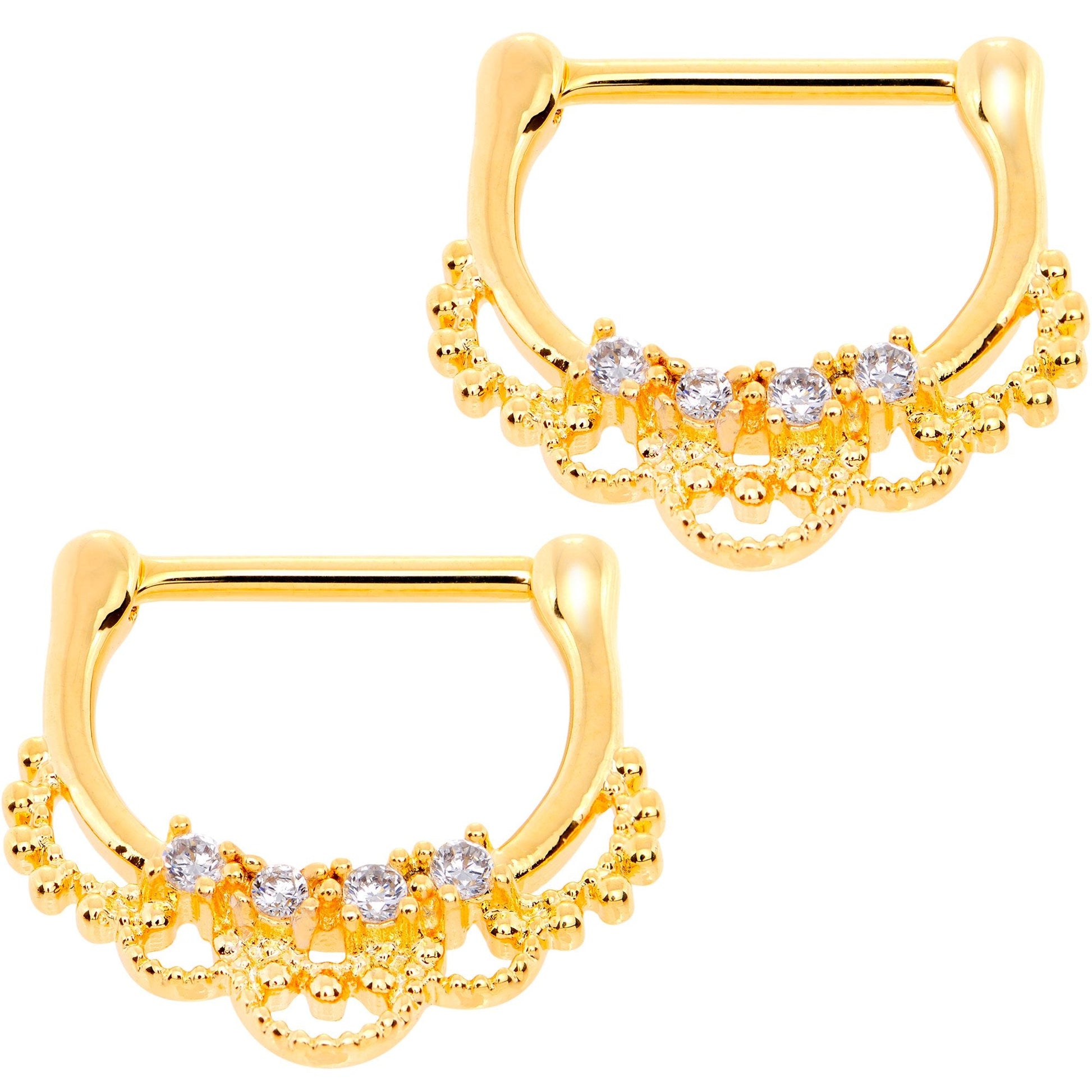 9/16" Clear CZ Gem Gold Tone Anodized Filigree Nipple Clicker Set