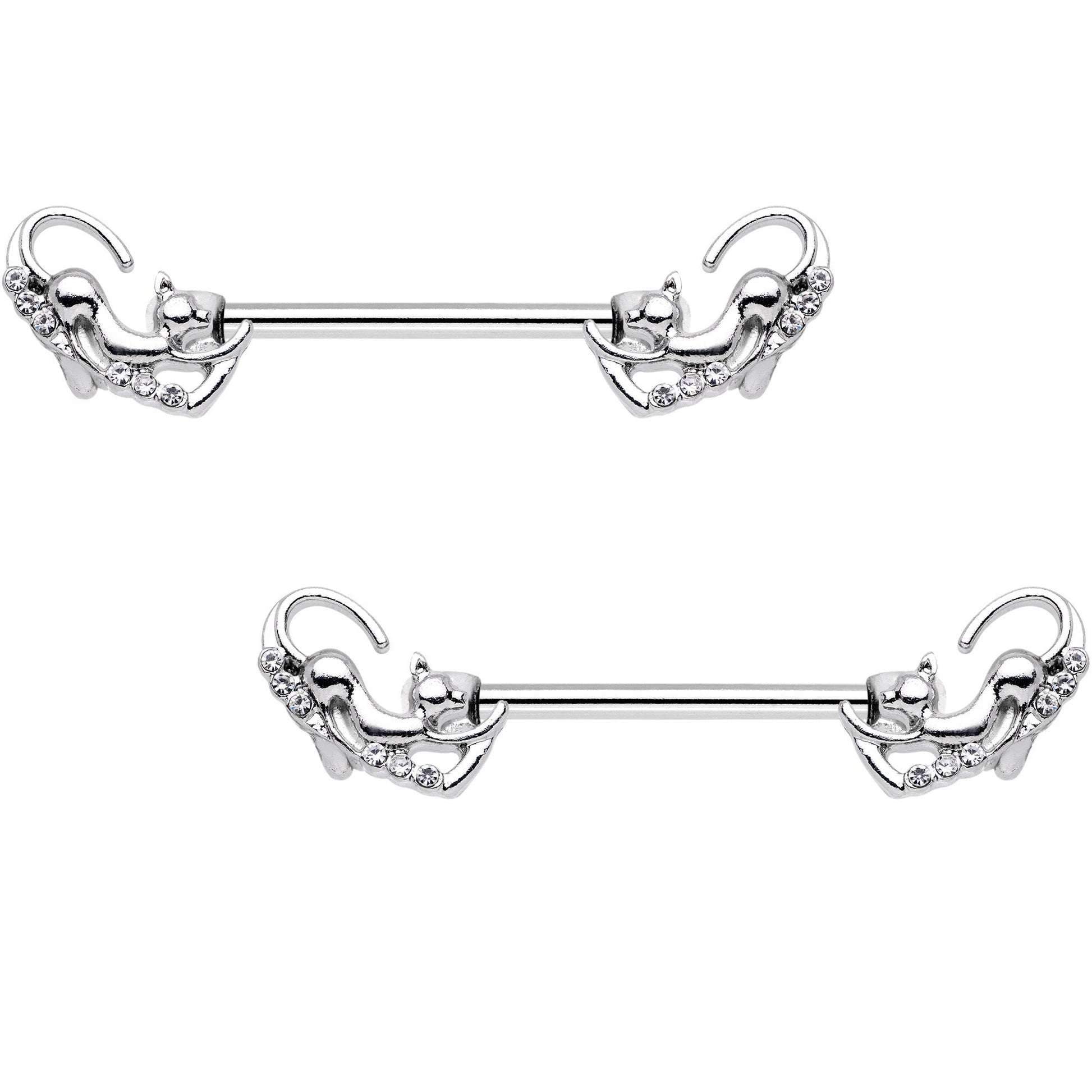 The fun kitty cat's on this set of nipple jewelry is just relaxing. You can almost hear them meow! A pair of stretching kitty cats, encrusted with clear mini gems, sit on the end of each of these 14 gauge barbell nipple rings. The straight barbells measure 9/16" in length and are made with durable 316L surgical grade stainless steel. Sold as a pair of two for you!Specifications