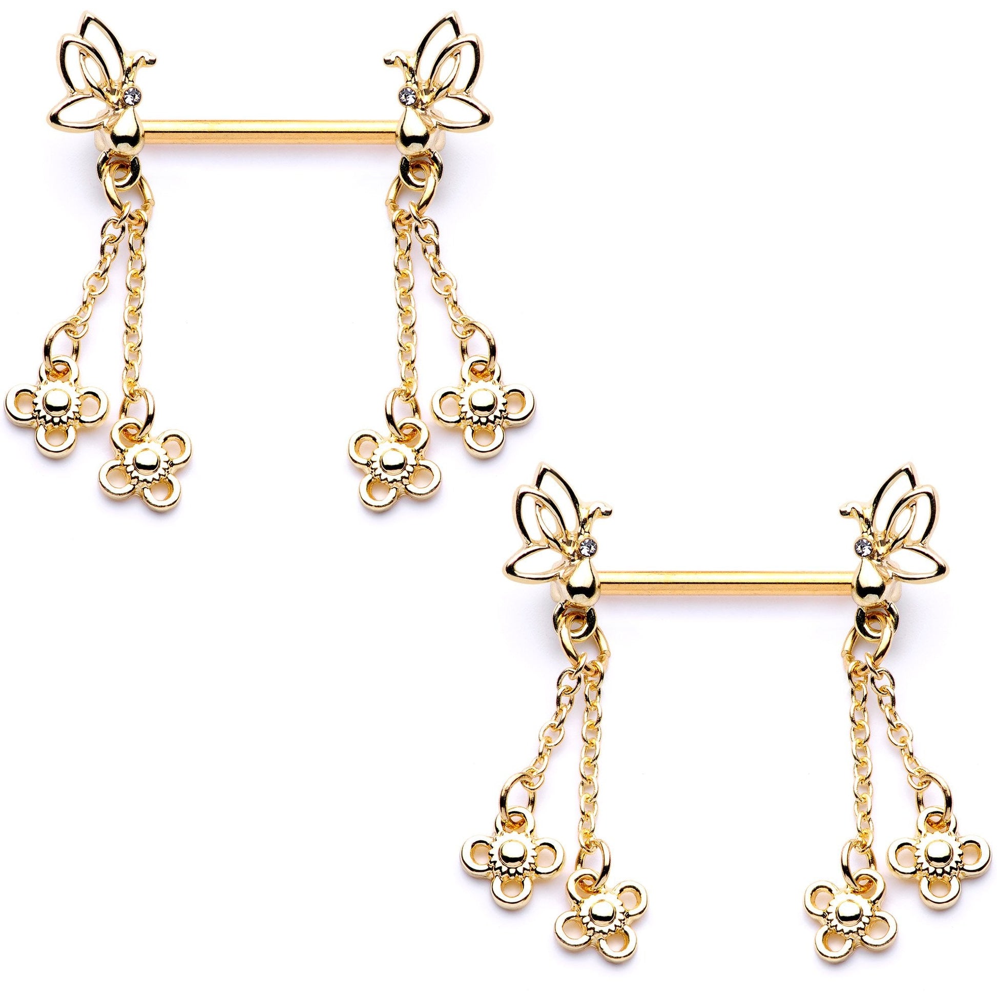 These 14 gauge nipple piercings have an airy, feminine feel to them - but that doesn't mean they're fragile. The 14mm nipple jewelry is made with gold tone plated over 316L surgical grade stainless steel straight barbells. They feature ends with openwork butterflies, embellished with small clear gems which provide a lovely pop of contrast. The butterflies each have two small chains hanging from them, each one tipped with a petite flower with loopy openwork petals. The flowers and butterflies will make you feel like it's springtime all year long while giving you a ladylike look that you're bound to love. Sold as a set of two.Specifications