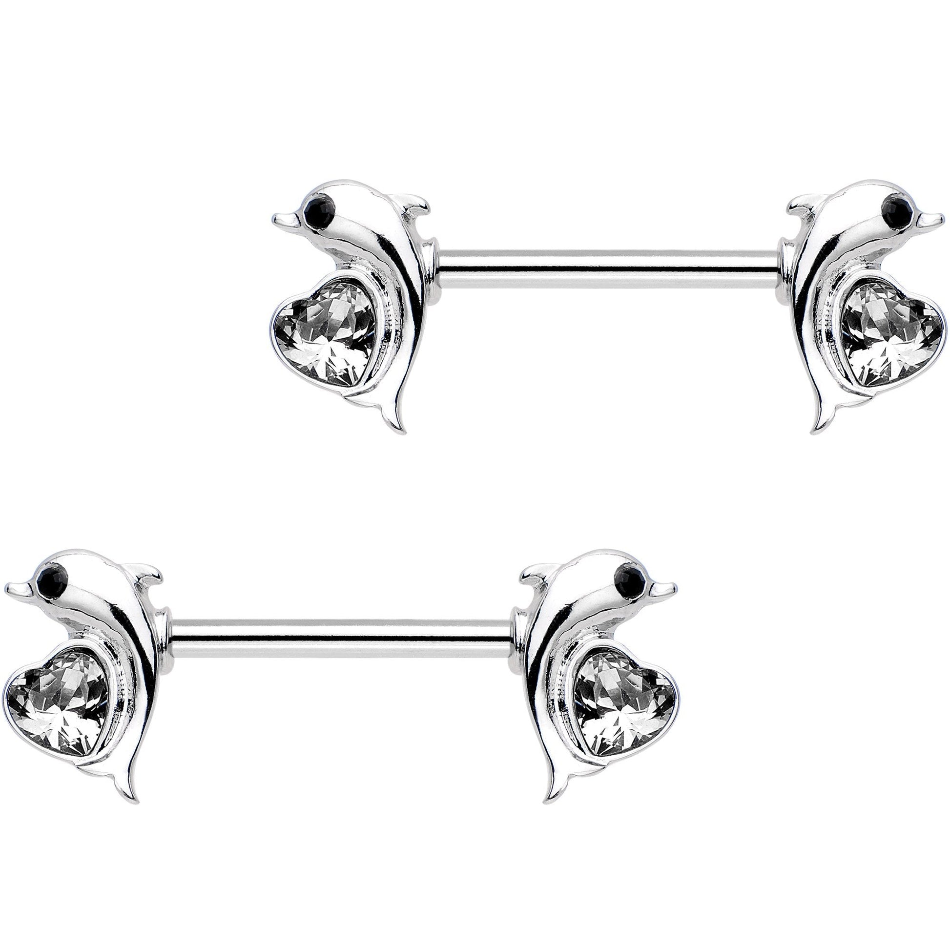 Dress up your breasts with this pair of delicately detailed 14 gauge sea creature inspired nipple rings. Made with 14mm durable 316L surgical grade stainless steel straight barbells, this pair of nipple piercings features a double dolphin design with clear heart-shaped gem accents. Sold as a set of two for your ladies and you!