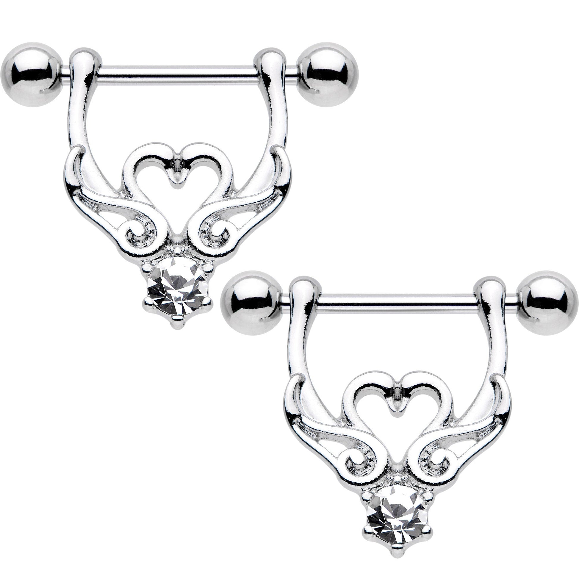 Dress up your breasts and express the infiniteness of your love with this intimate kissing swan 14 gauge, 6mm rise heart drop nipple ring set. Two swans become one to create a delicate heart on this beautiful piece, made with 9/16" long durable 316L surgical grade stainless steel straight barbells. The hollow heart design is accented with an exquisite clear gem. Sold as a set of two for you!