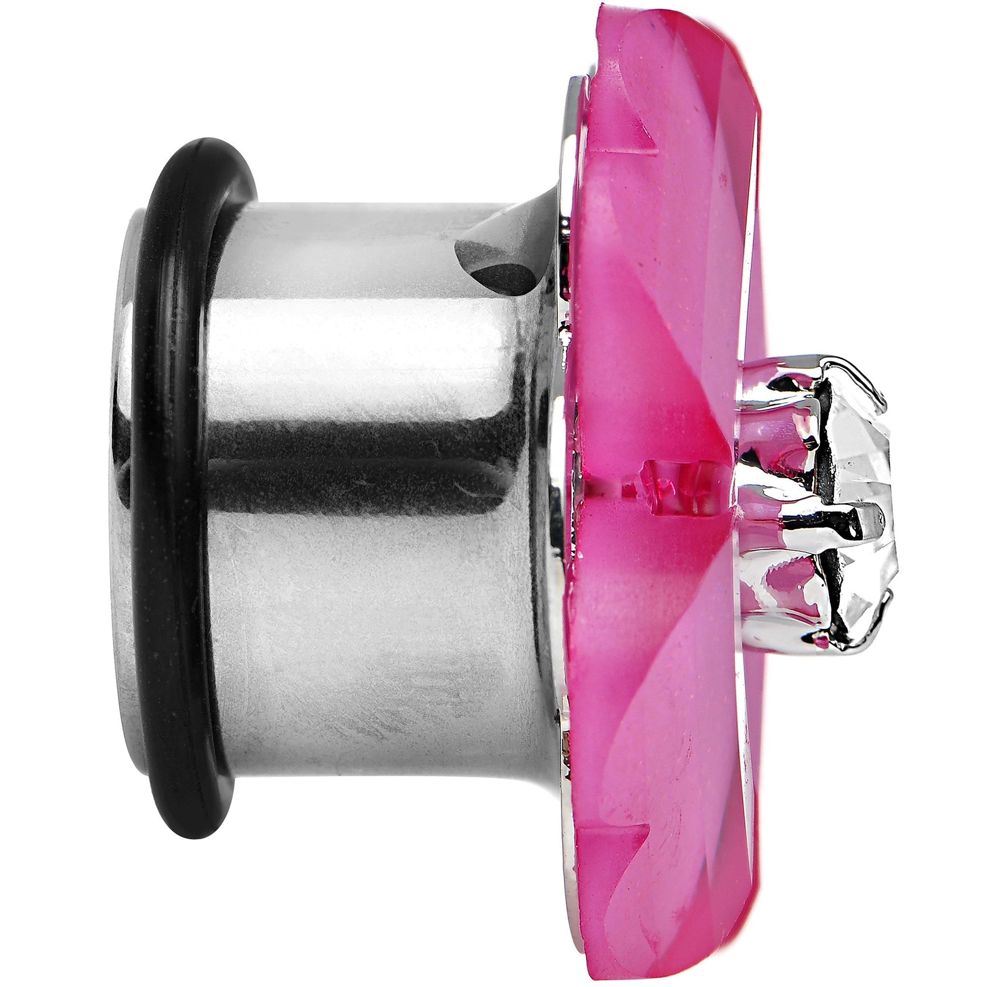 Hypoallergenic jewelry for sensitive skin.Item sold individually, purchase two for a pair. Carry a piece of spring with you any time of year when you wear this 14mm pink acrylic flower-topped 304L stainless steel plug. The single flare ear stretcher's pretty posy has a clear gem center and includes one rubber O-ring. Pierced ear expander ear gauge tunnel plug.