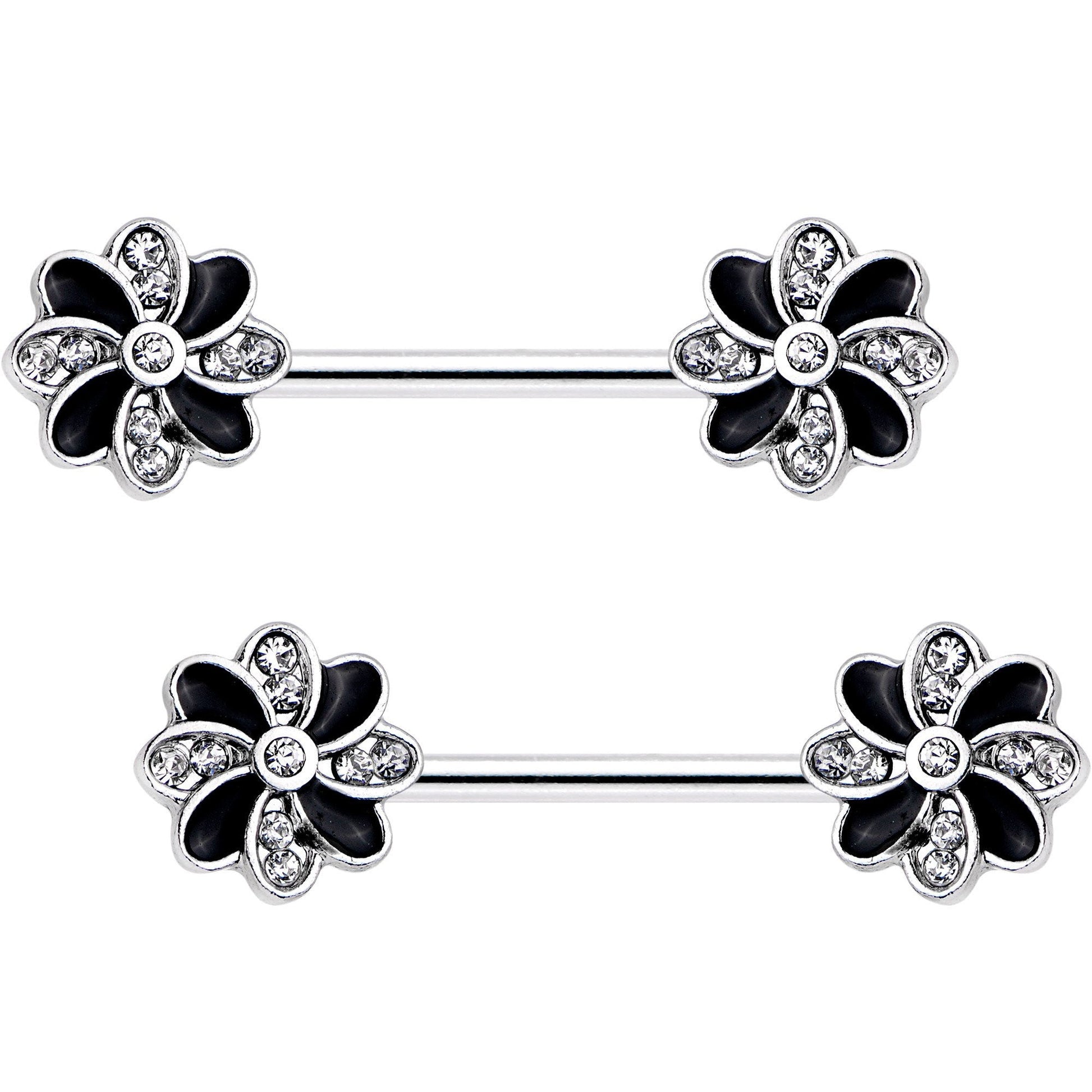 Dress up your breasts with the essence of floral fashion when you wear this pretty pair of 14 gauge nipple piercings. Made with 14mm durable 316L surgical grade stainless steel straight barbells, this set of nipple jewelry features pinwheel style flower ends formed with clear gems. This flowering pair of nipple barbells is sold as a set of two for the girls and you!