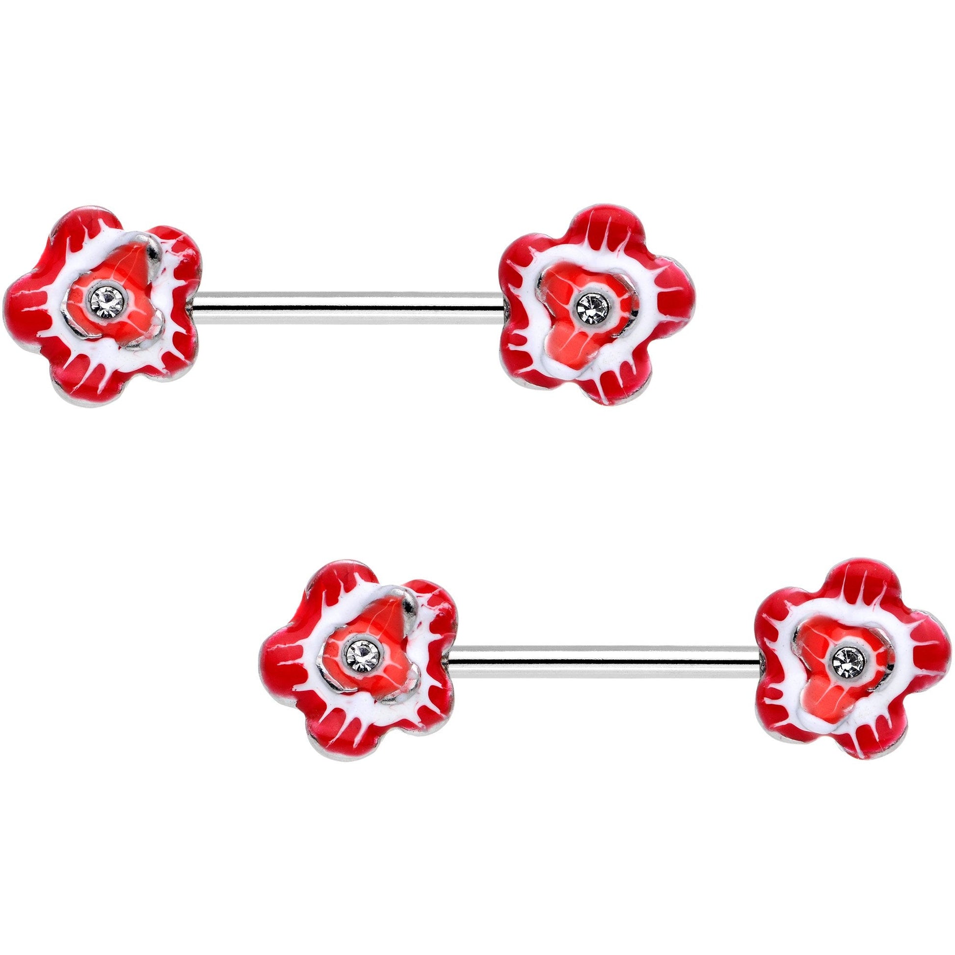 Be my buttercup! This red anemone buttercup flower jewelry is ready to be yours. Each end of these barbell nipple piercings features a blooming buttercup flower with red and white detail and tiny clear mini gems at their centers. The buttercup charms are mounted on a pair of 9/16" straight barbells made with durable 316L surgical grade stainless steel. Sold as a set of two.Specifications