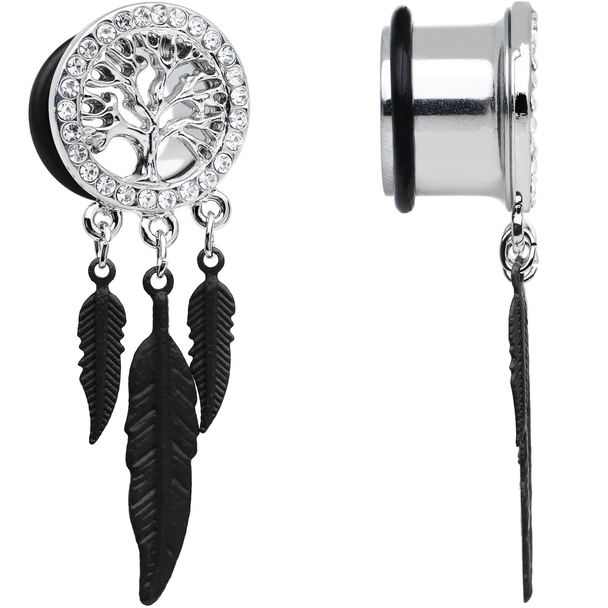 Let everyone know that your spiritual side is in perfect balance with these 9/16" 316L surgical grade stainless steel tree of life single flare plugs with black feather dangles and clear gem accents that draw the eye. This item includes rubber o-rings and is sold in a set of two.