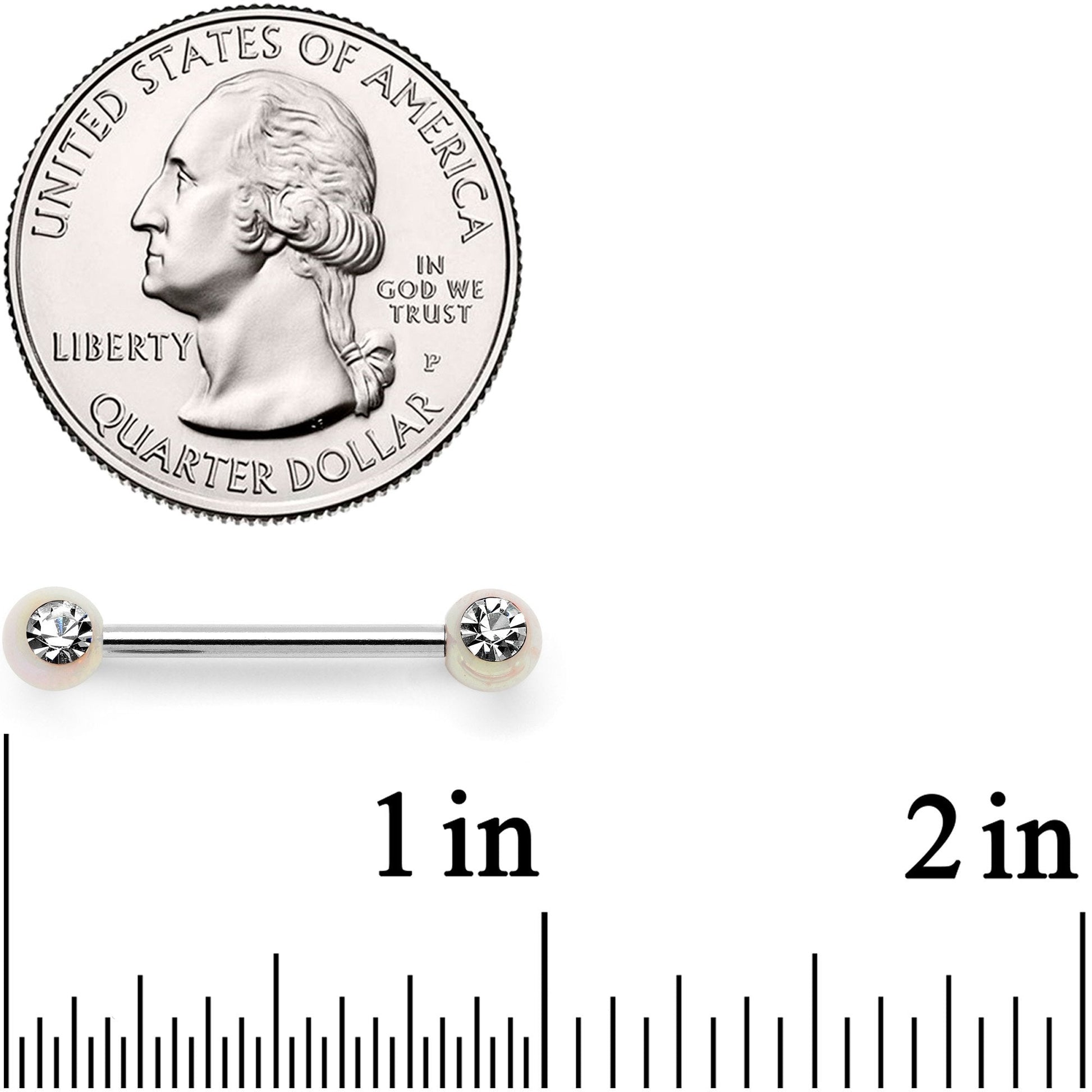 Clear gems and pearly acrylic make this a luxe-looking set of nipple piercings! This 14 gauge nipple jewelry is 14mm long and made with durable 316L surgical grade stainless steel straight barbells. They have clear gems set into the pearlescent acrylic ball ends for a rich detail that truly separates them from the ordinary and makes them extraordinary. And who doesn't want to be extraordinary? Sold as a pair.Specifications