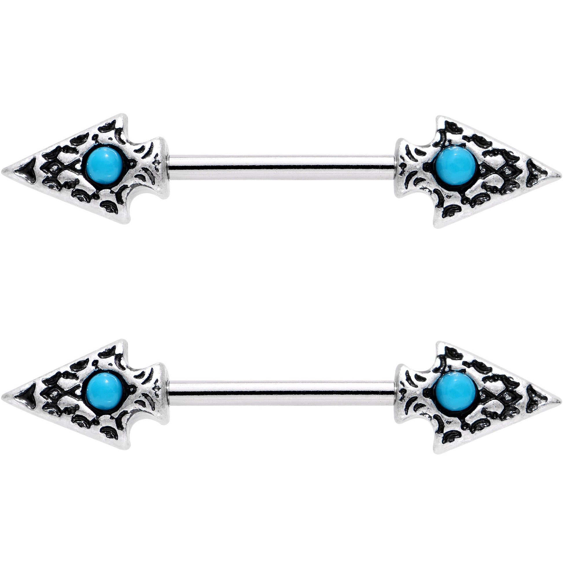 Make your breasts feel like a dangerously decorated dream when you wear this pair of 14 gauge nipple piercings. Made with 14mm durable 316L surgical grade stainless steel straight barbells, this nipple jewelry set features arrowhead ends on either side decorated with faux turquoise detail and is sold as a set of two. Whether you are into beautiful, eye-catching fashions or southwestern style this barbell nipple ring set will make your girls look dangerously good!