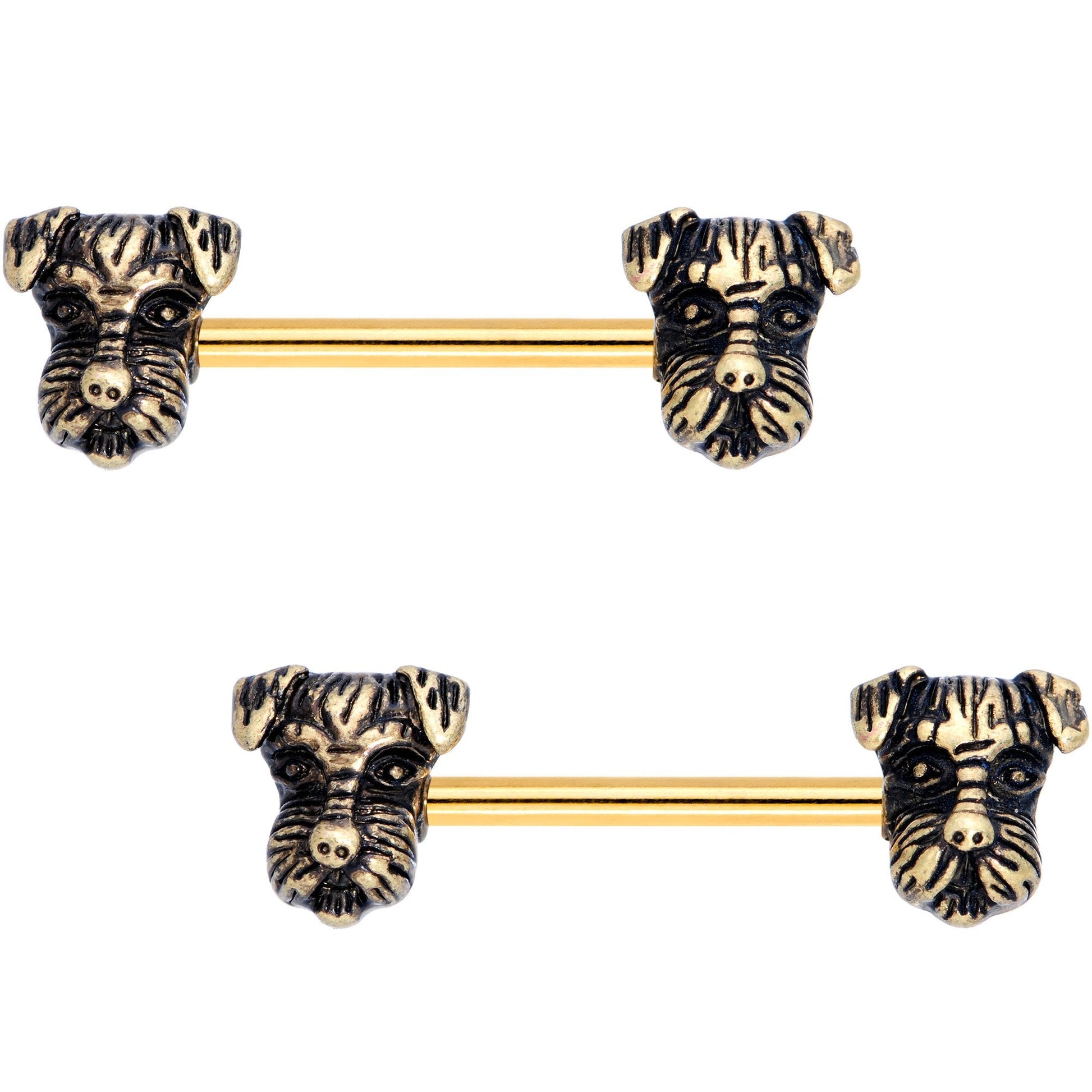 You love your dog, now show the world! These barbell nipple rings each feature a pair of the cutest doggos you've ever seen! The dog-friend charms are mounted on a pair of 9/16" in length straight barbells made with gold PVD over 316L surgical grade stainless steel. Perfect for dog lovers of every breed! Sold as a set of two.Specifications