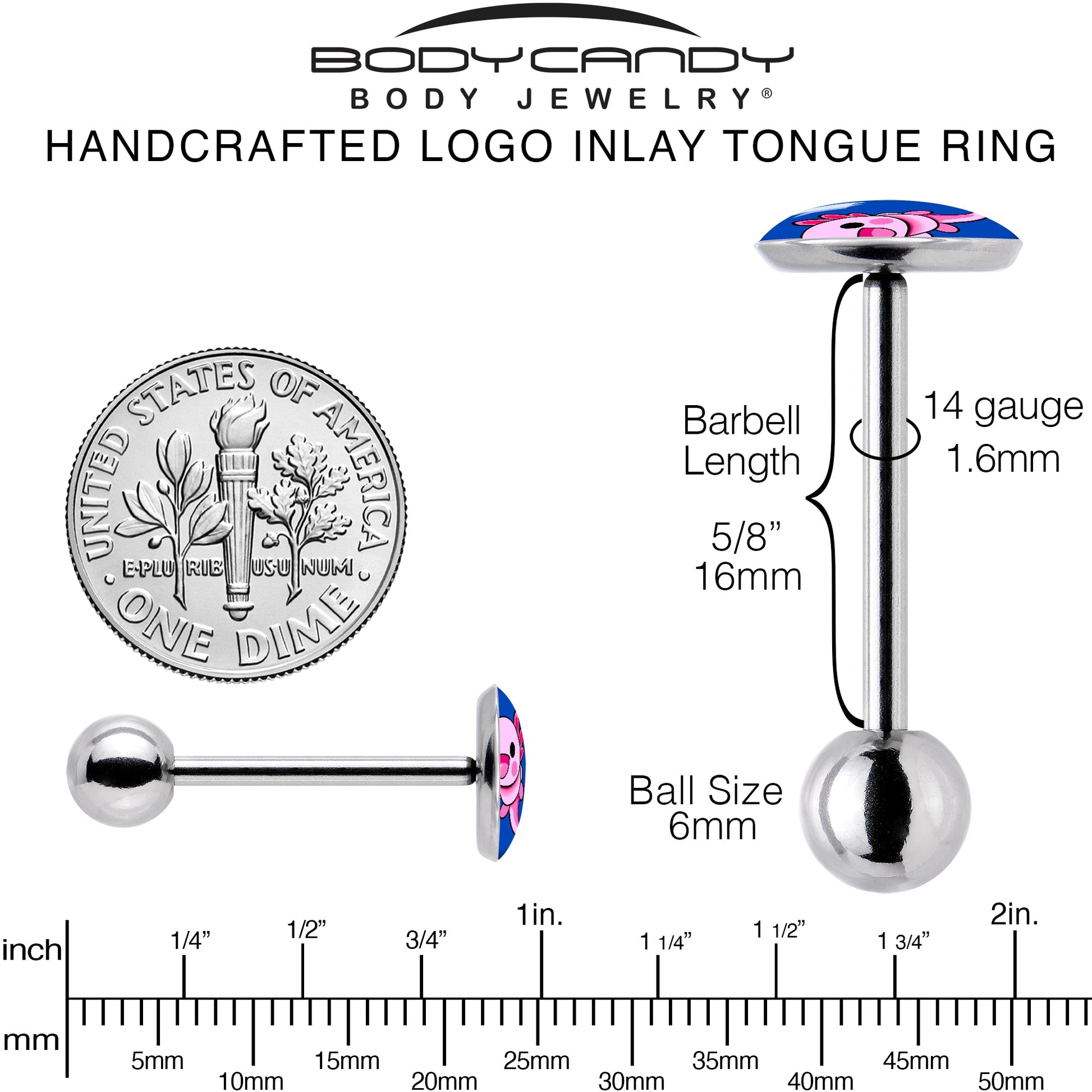 The amazing amphibian on this 14 gauge tongue jewelry is so adorable you will love it forever. It is made with a 5/8 inch 316L surgical grade stainless steel straight barbell with a 6mm bottom ball end. The top end features a disc shaped logo in blue, with a sweetly smiling axolotl in shades of pink. The axolotl has its mouth open in an inviting smile that will make you smile too, This cute little critter is sure to rule your jewelry collection with this tongue piercing ring.