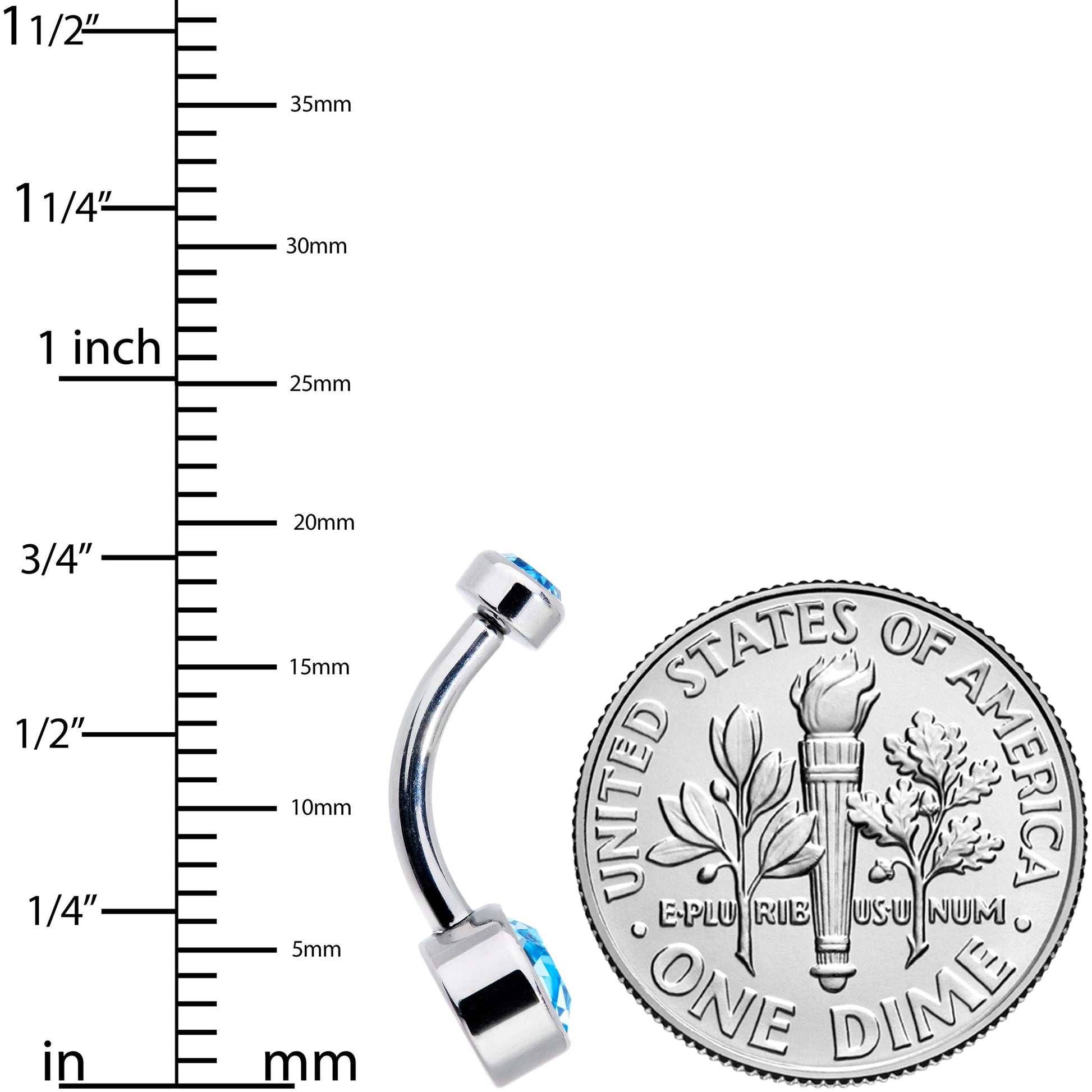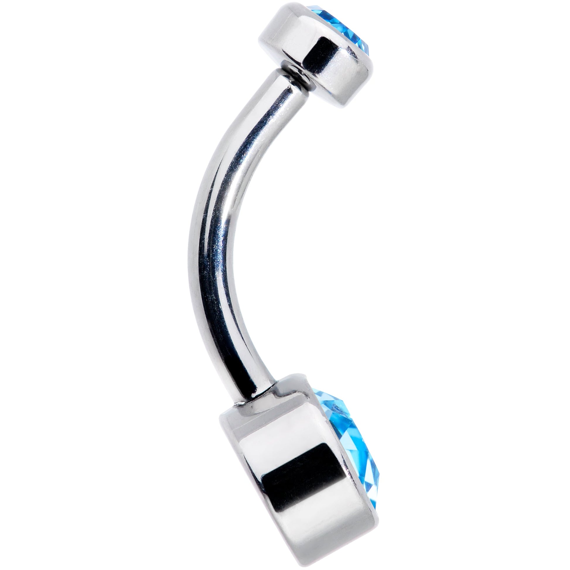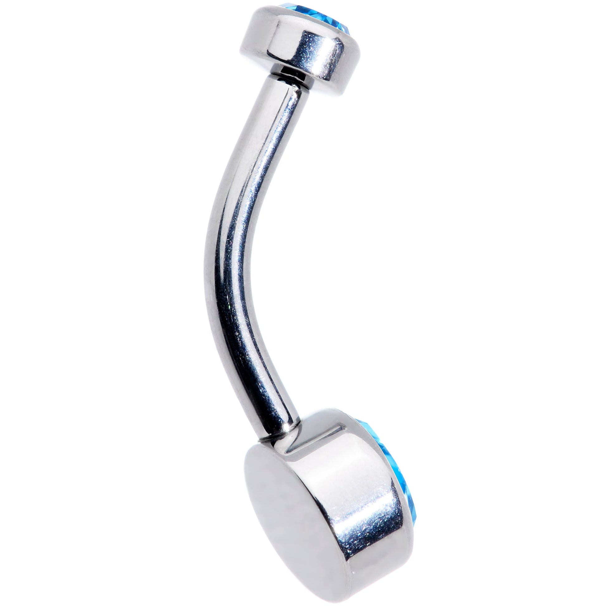 Keeping it simple doesn't mean keeping it boring or sacrificing quality with this 14 gauge navel ring! It's made with a 3/8" solid grade 23 implant grade titanium curved barbell. The 4mm top end and 6mm bottom end feature aqua crystals created with Crystals. It's also internally threaded for super comfortable insertion and removal. If you want to add some color and glamour to your belly piercing but keep an elegant appearance, this belly button jewelry has everything you need in one beautiful, comfortable package!Specifications