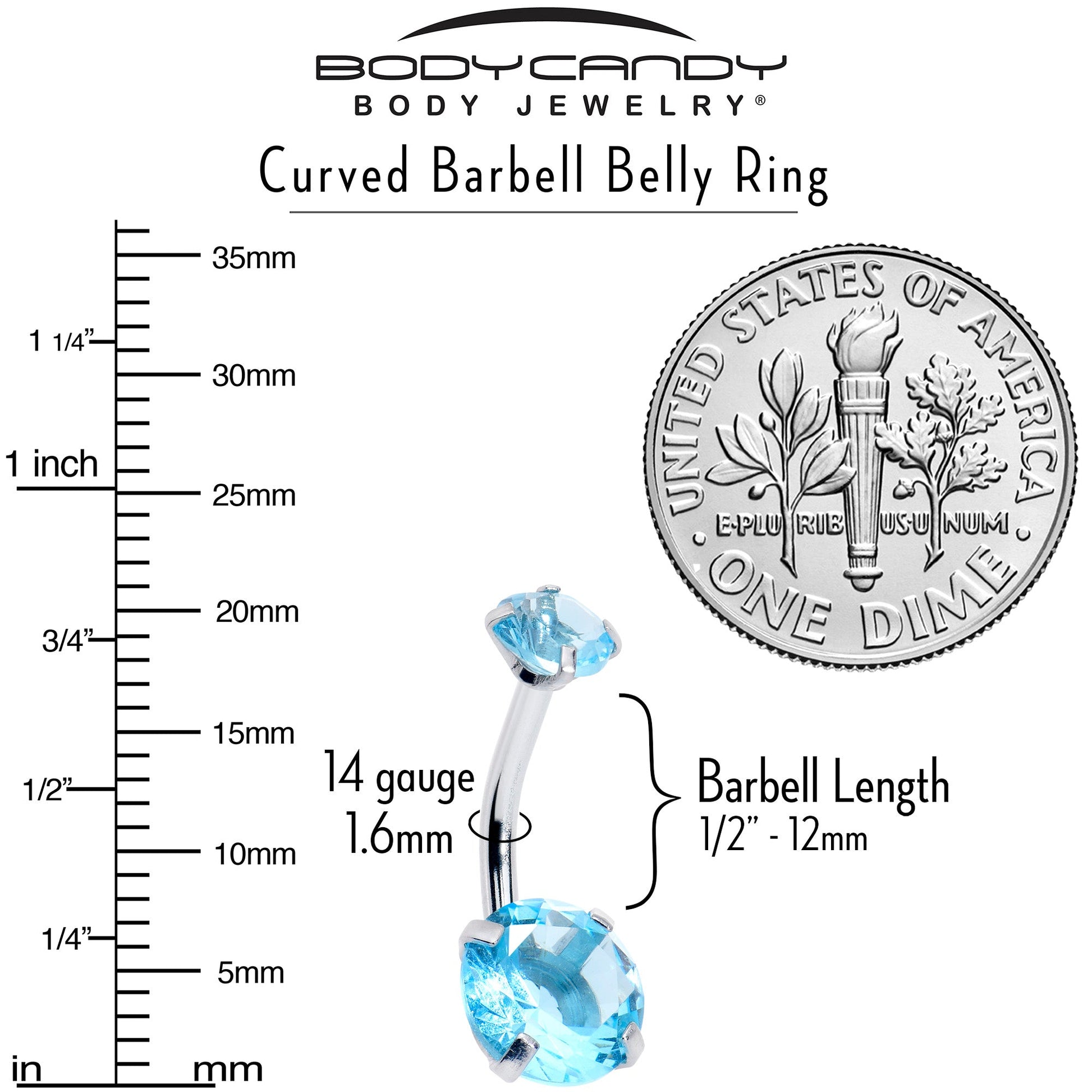 Party like it's your birthday all year long when you are rocking this 14 gauge navel ring. It is made with a 3/8 inch 316L surgical grade stainless steel curved barbell. Each of the ends features a light blue gem that emulates the birthstone for month of March. Get festive and fabulous all year long with this charming belly piercing jewelry. Double gem belly button ring; birthstone belly button ring.Specifications