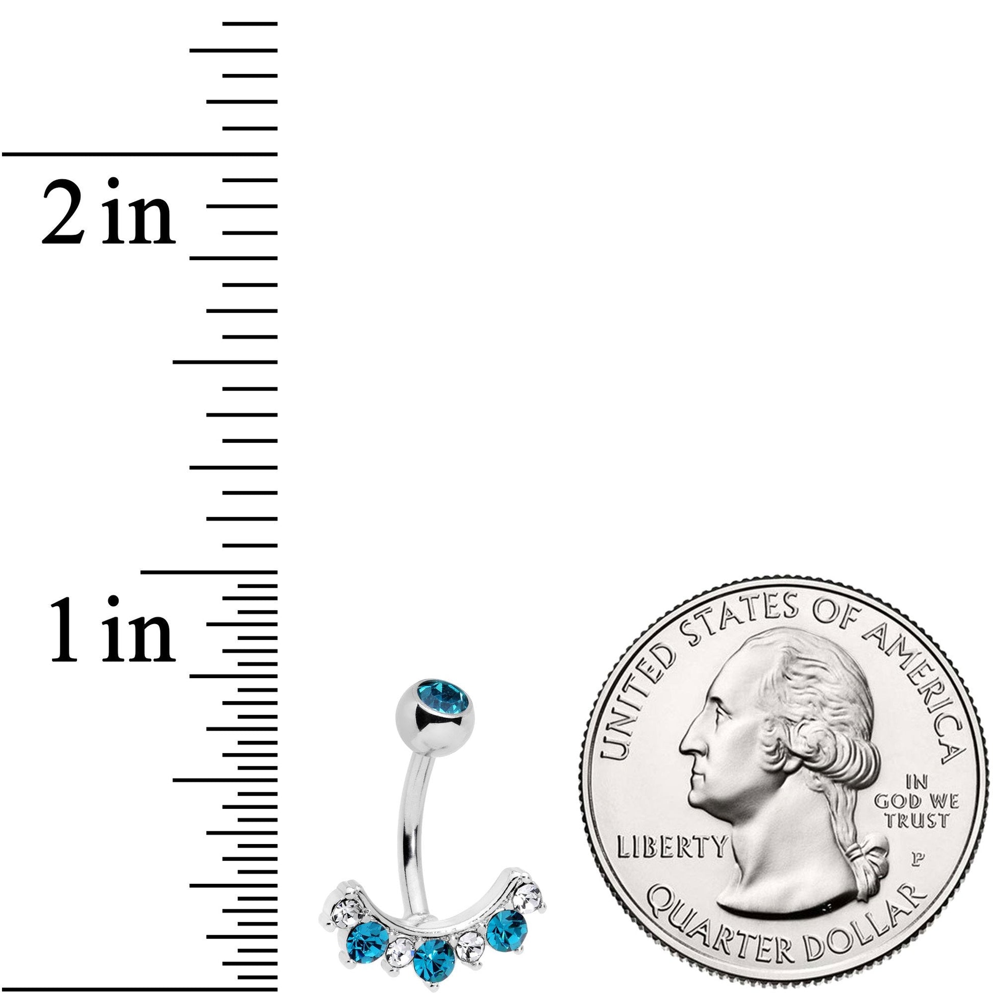 Get swept away in a wave of aqua and clear cubic zirconia gems with this stunning 14 gauge navel ring. It's 3/8", has an aqua cubic zirconia gem on the top and is finished by a row of alternating blue and clear cubic zirconia gems at the bottom - the kind of carefully designed details that will have everyone checking out your piercing AND you! Made with a durable 316L surgical grade stainless steel curved barbell, this belly ring is both beautiful and built to last...just like you are!Specifications