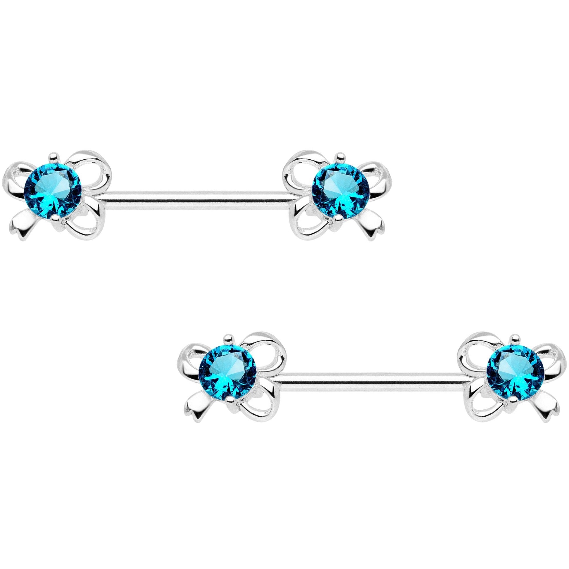 You'll feel all tied up in knots if you don't grab these fun nipple rings right now. These 14 gauge barbell nipple rings feature bows all tied in knots at each end, decorated by sparkling aqua cubic zirconia gems. The bow tie ends are mounted on a pair of 5/8" in length durable 316L surgical grade stainless steel straight barbells. Sold as a pair of two for you!Specifications