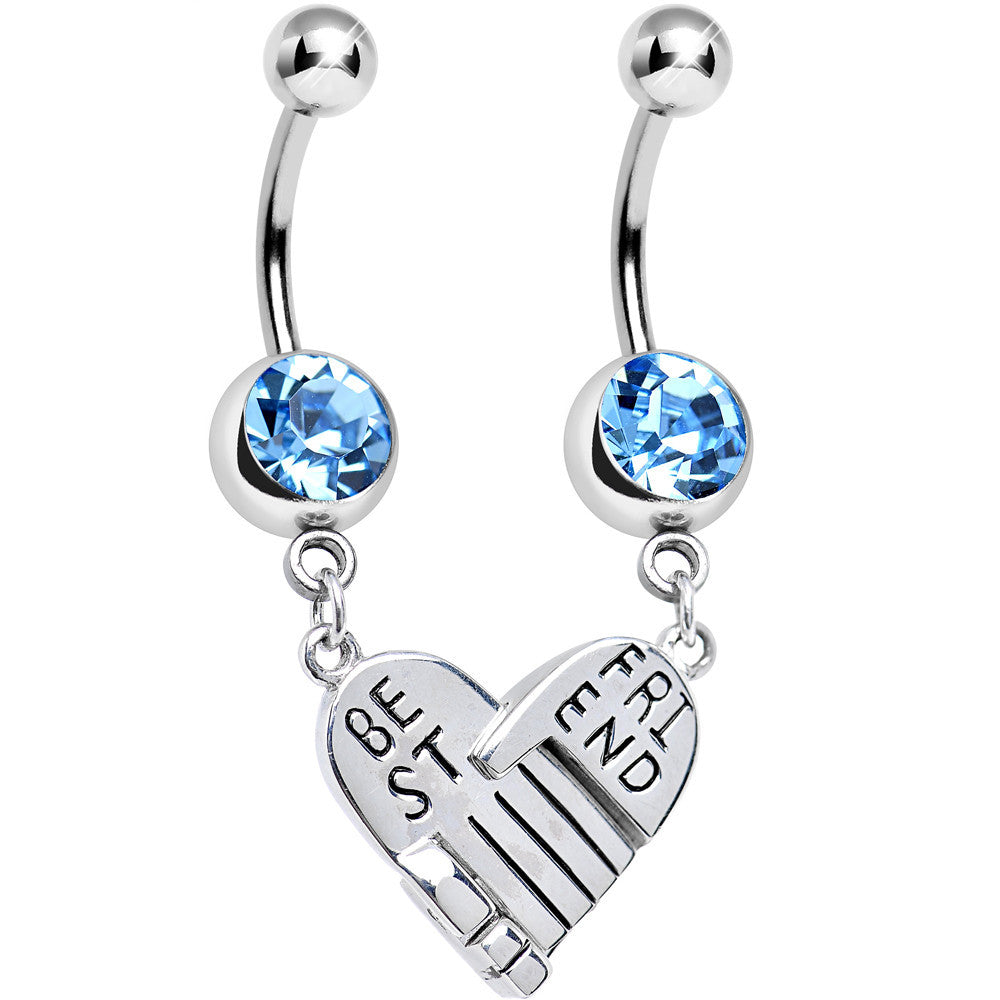 Share your love with your best friend with this holding hand dangle belly button ring set. Each navel ring comes with a single aqua gem set above a dangle hand charm; one with the "Best" title and the other with "Friends." Charms fit together to create a single heart. Best friends body jewelry belly ring.