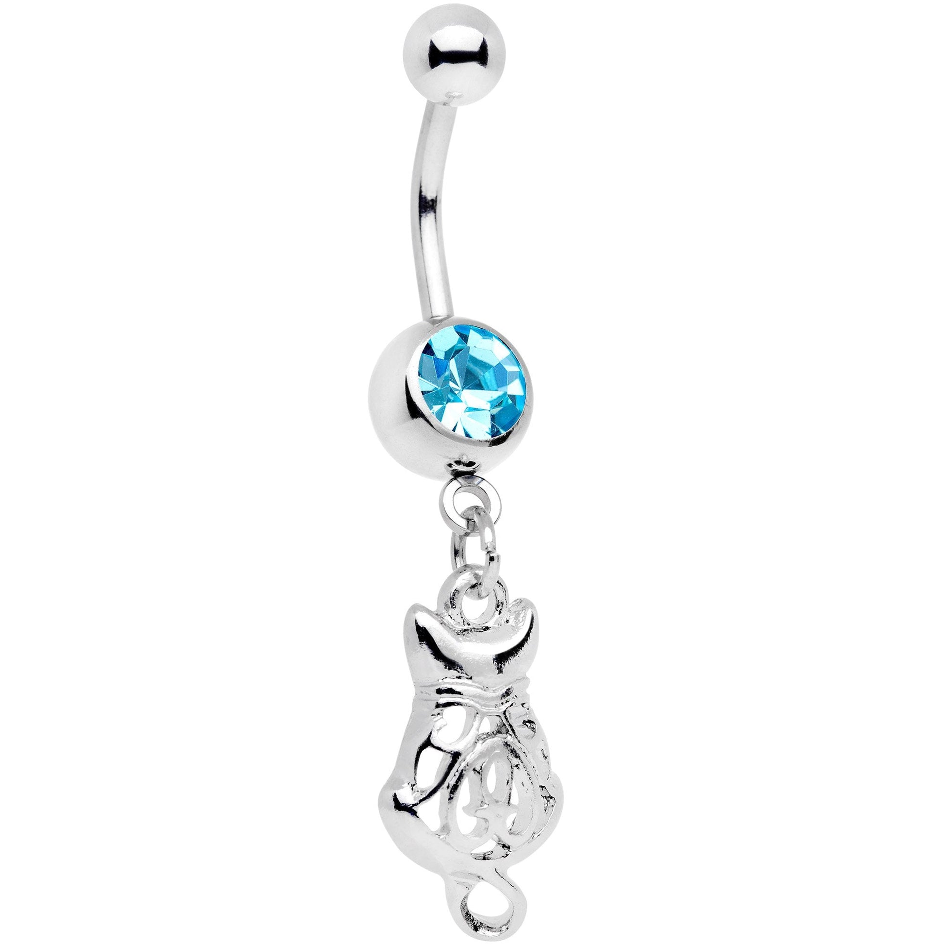 This cute kitty cat just exudes lucky vibes! This 14 gauge belly ring features a fun hollow filigree kitten dangle charm. The lucky cat charm dangles from a 7/16" curved barbell made with durable 316L surgical grade stainless steel. A bottom ball aqua gem completes the look on this fun dangle belly ring.Specifications