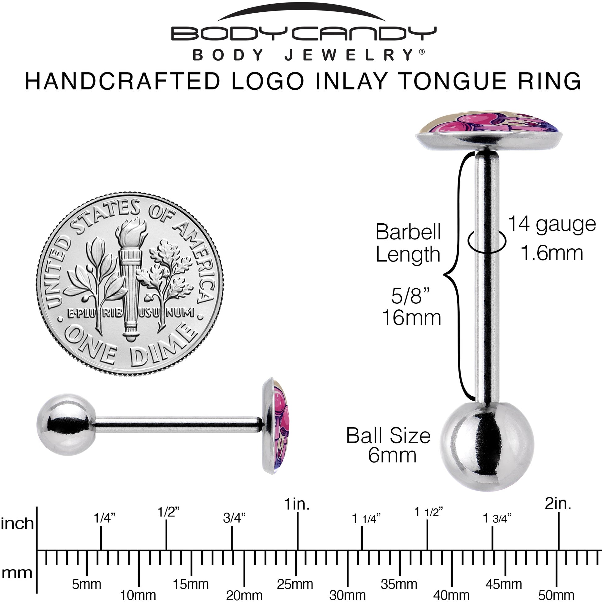 Make room for shrooms with this trippy 14 gauge tongue barbell. It's made with a 5/8 inch 316L surgical grade stainless steel straight barbell with a 6mm bottom ball end. The top end features a disc logo charm with a beige background. It features extravagantly pink and purple mushrooms, happily growing in a field. Let these funky fungi give you psychedelic style with this colorful tongue piercing jewelry.