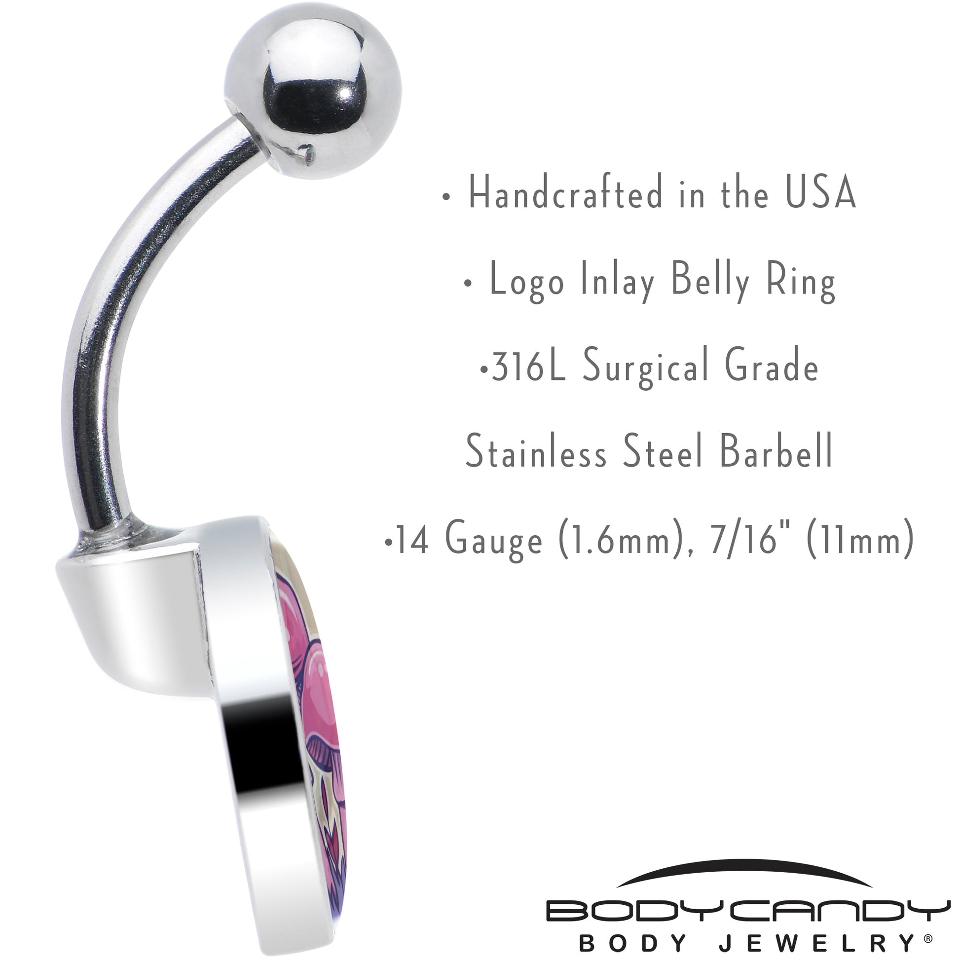 Make room for shrooms with this trippy 14 gauge navel ring. It's made with a 7/16 inch 316L surgical grade stainless steel curved barbell with a 5mm top ball end. The bottom end features a disc logo charm with a beige background. It features extravagantly pink and purple mushrooms, happily growing in a field. Let these funky fungi give you psychedelic style with this colorful belly piercing jewelry.