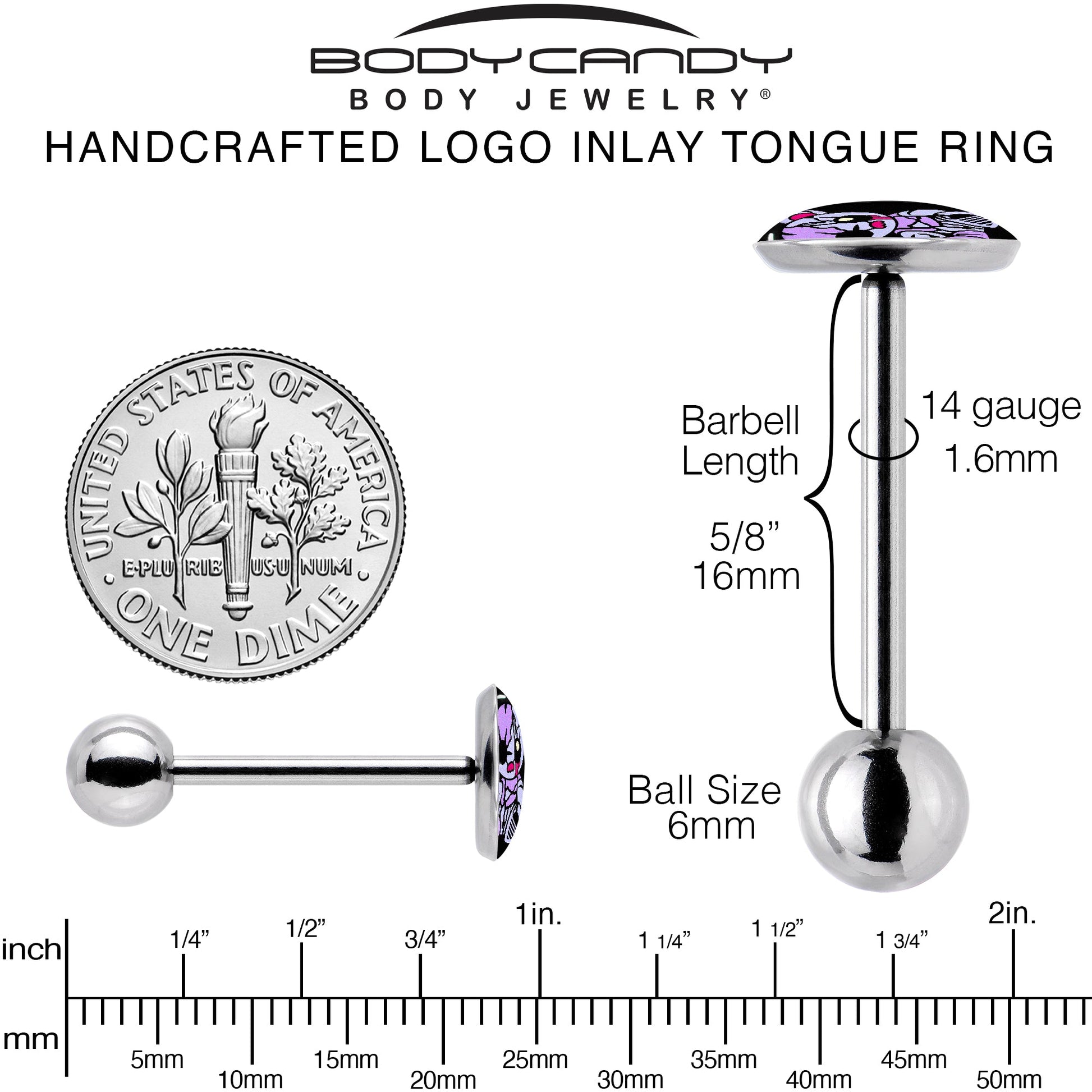 This teddy bear is cuddly cute with an edge on this 14 gauge tongue ring. It's made with a 5/8 inch durable 316L surgical grade stainless steel straight barbell with a 6mm bottom ball end. The top end features a black disc charm with a purple teddy bear. The teddy bear is scarred and missing an eye for a look that full of edgy attitude you can't help but want to cuddle. Give your look a stylish snuggle with this punk teddy bear tongue piercing jewelry.