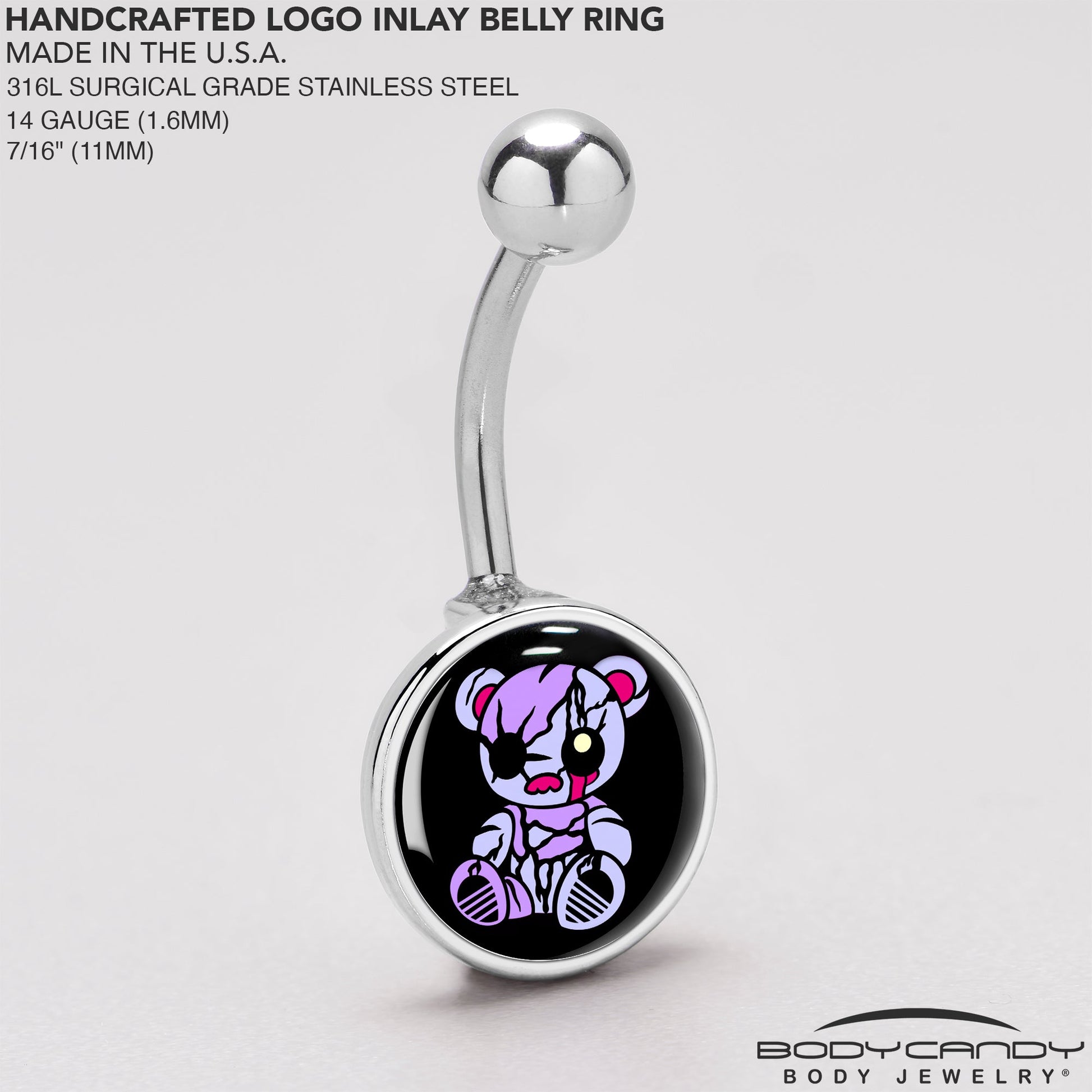 This teddy bear is cuddly cute with an edge on this 14 gauge navel ring. It's made with a 7/16 inch durable 316L surgical grade stainless steel curved barbell with a 5mm top ball end. The bottom end features a black disc charm with a purple teddy bear. The teddy bear is scarred and missing an eye for a look that full of edgy attitude you can't help but want to cuddle. Give your look a stylish snuggle with this punk teddy bear belly piercing jewelry.
