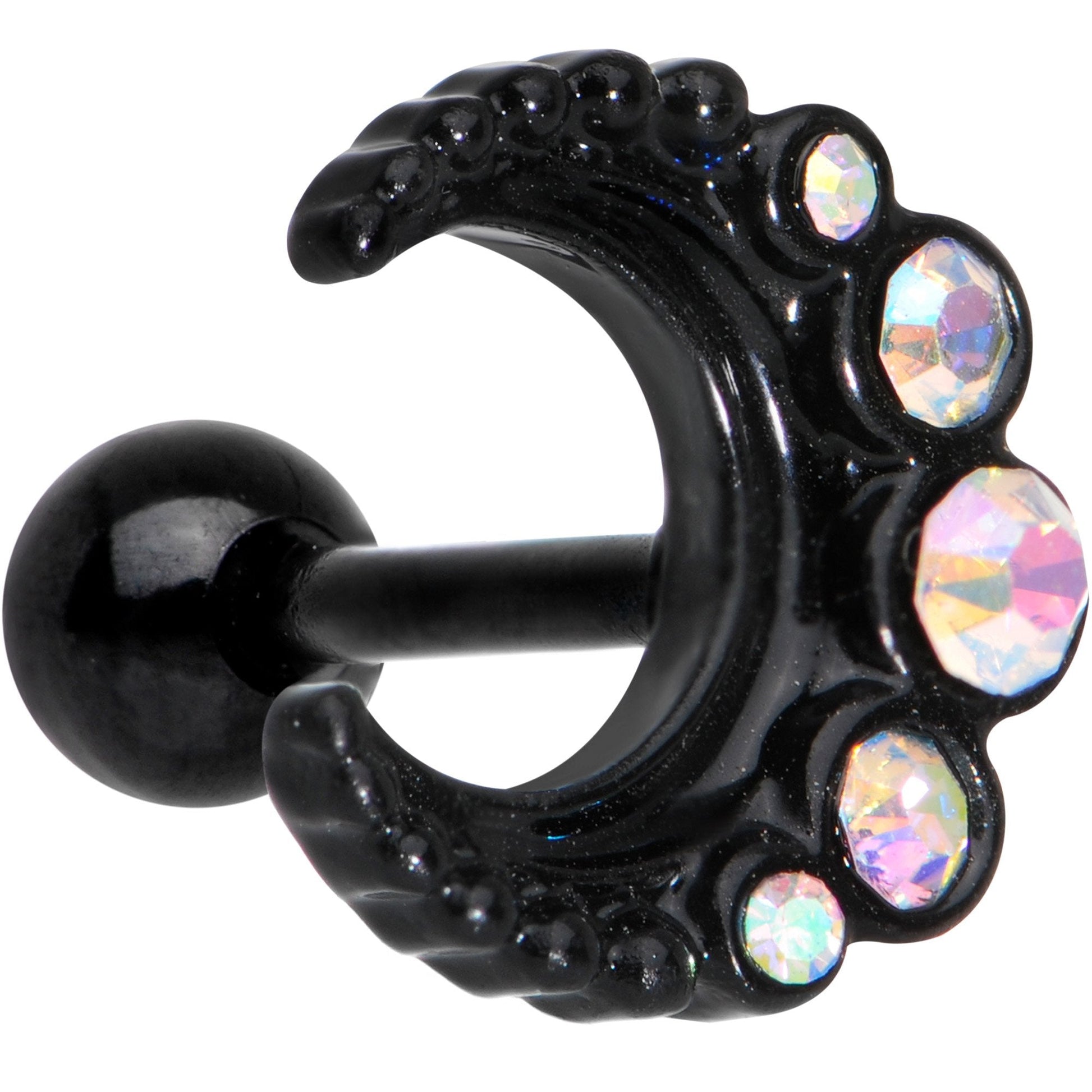 This moon sparkles just like a star! A beautiful crescent moon design is the centerpiece of this unique 16 gauge cartilage tragus earring. The crescent moon on this cartilage piercing features aurora gems and a blue streak along the rim. Made with a 6mm in length black anodized over 316L surgical grade stainless steel straight barbell, this ear jewelry is great for a variety of cartilage piercings.