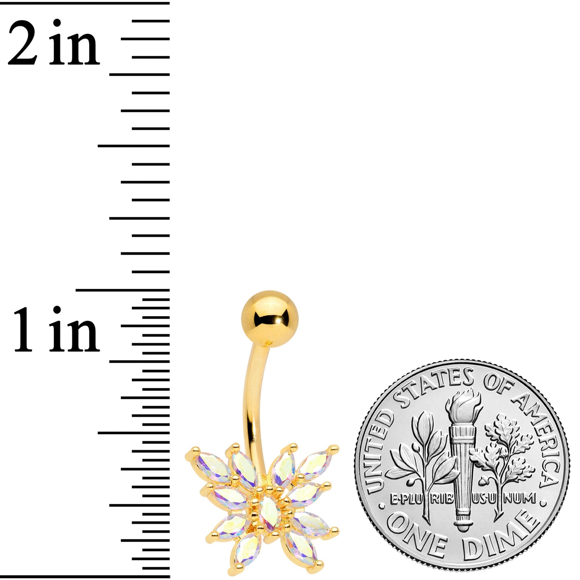 This beautiful butterfly is brimming with style on this 14 gauge navel ring! It's made with a 3/8" gold tone plated over 316L surgical grade stainless steel curved barbell with a 5mm top ball end. The bottom end features a stylized butterfly charm, composed entirely of aurora cubic zirconia gems. The butterfly is further embellished with gold tone detailing for a look that's cohesive and and thoroughly elegant. Let your navel piercing spread its wings and soar with this bewitching butterfly belly button ring!Specifications