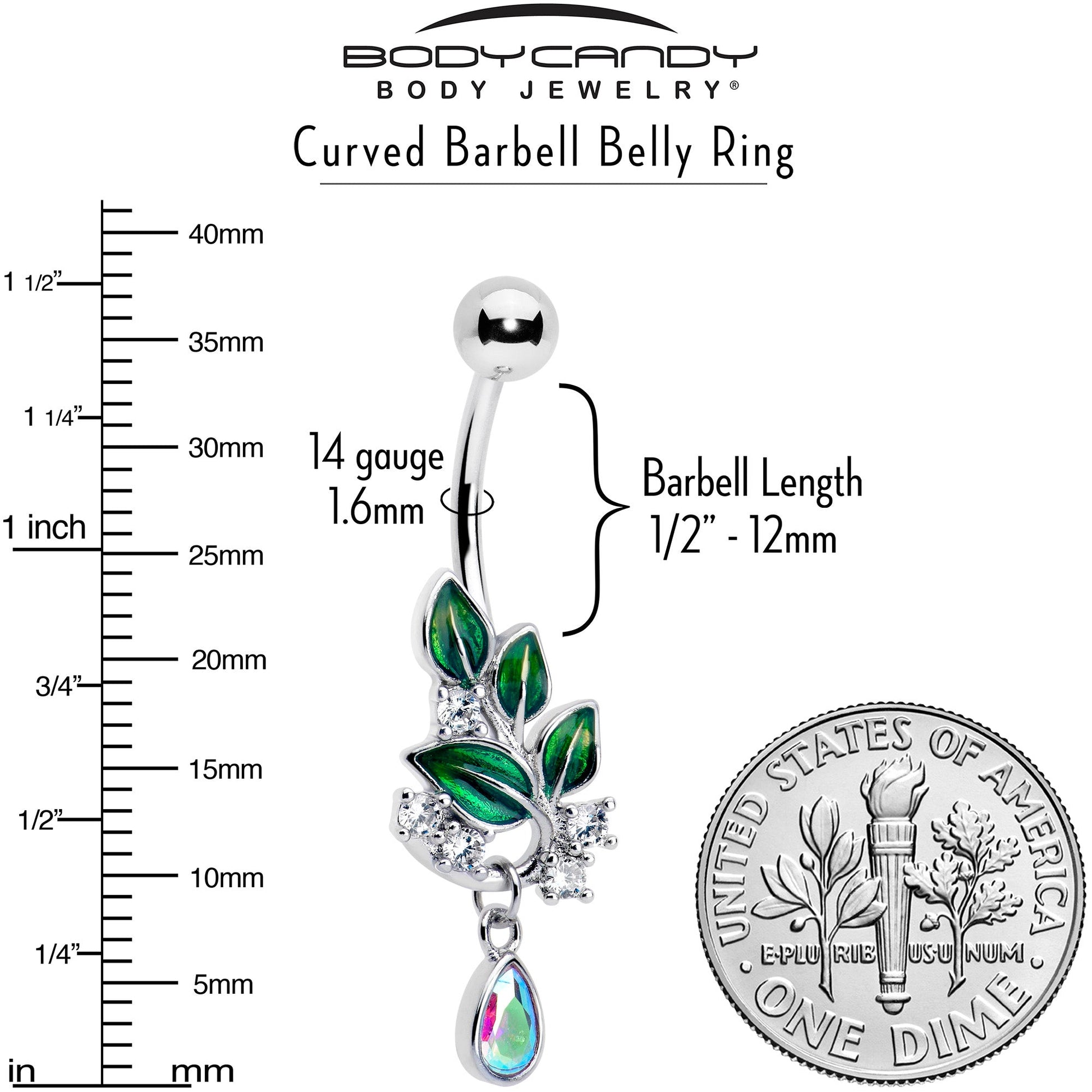 Let your look shine like the leaves in the morning with this 14 gauge navel ring. It's made with a 3/8 inch 316L surgical grade stainless steel curved barbell with a 5mm top ball end. The bottom features a green inlaid leaves charm, set among clear cubic zirconia gems. Dangling beneath it is a drop shaped aurora cubic zirconia gem dangle for added motion and style. Let your look turn over a new leaf of elegance with this lovely, leafy belly piercing jewelry.Specifications