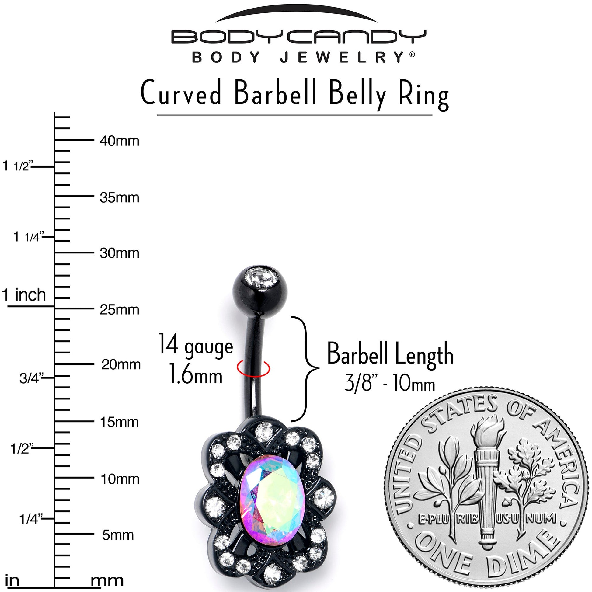 This 14 gauge navel ring is full of fairy tale elegance. It is made with a 3/8 inch black PVD over 316L surgical grade stainless steel curved barbell with a 5mm top ball end which is set with a clear gem. The bottom end features a filigree styled charm, with clear gems set along the edge and an aurora gem center. You can not help but feel the magic when you are wearing this fairy tale-worthy belly piercing jewelry.Specifications