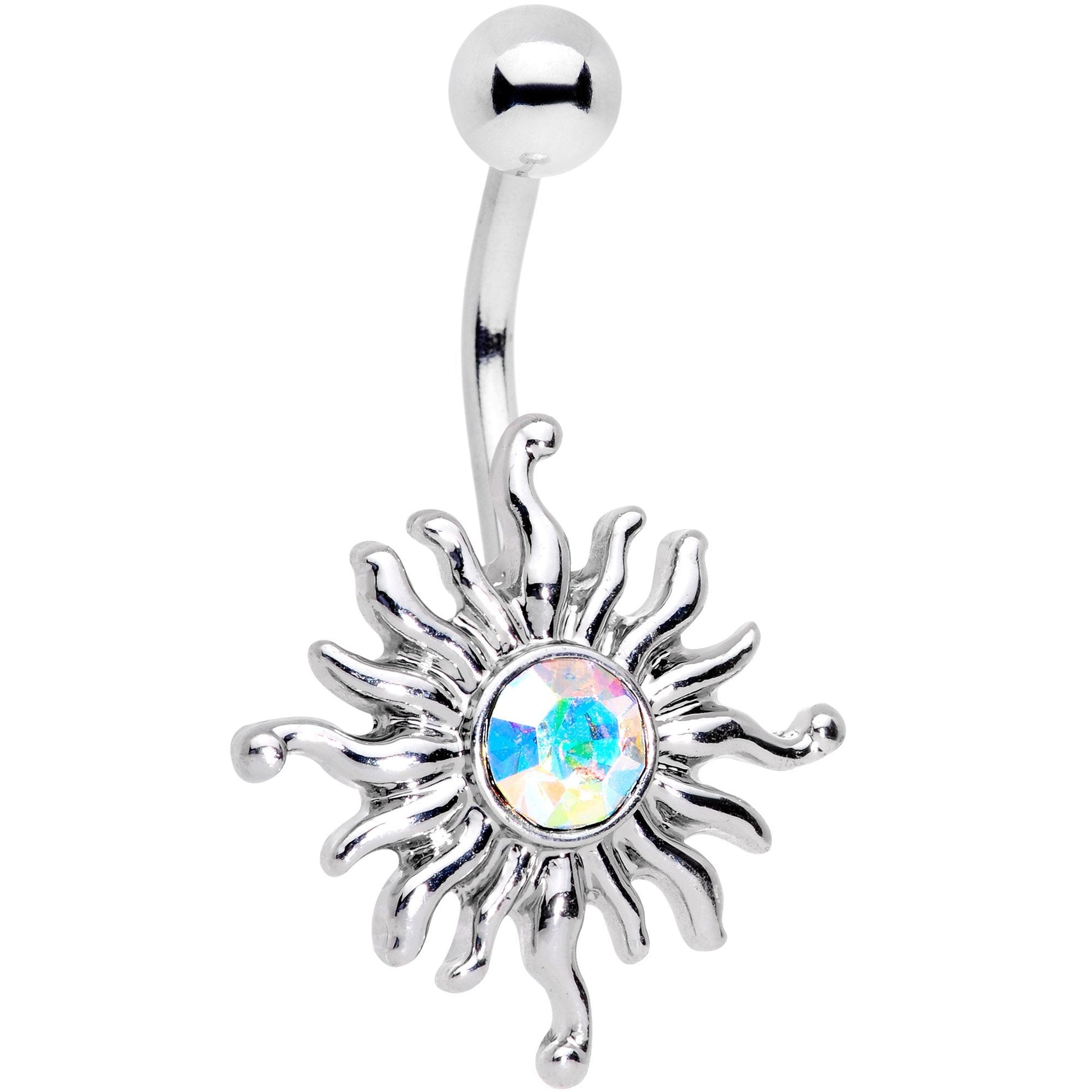 Whether you worship the sun or can't bear any other season than summer, this 14 gauge navel ring is about to lift your spirits. Made with a 7/16" durable 316L surgical grade stainless steel curved barbell, this belly button ring features a sunburst inspired bottom charm set with an aurora gem.Specifications