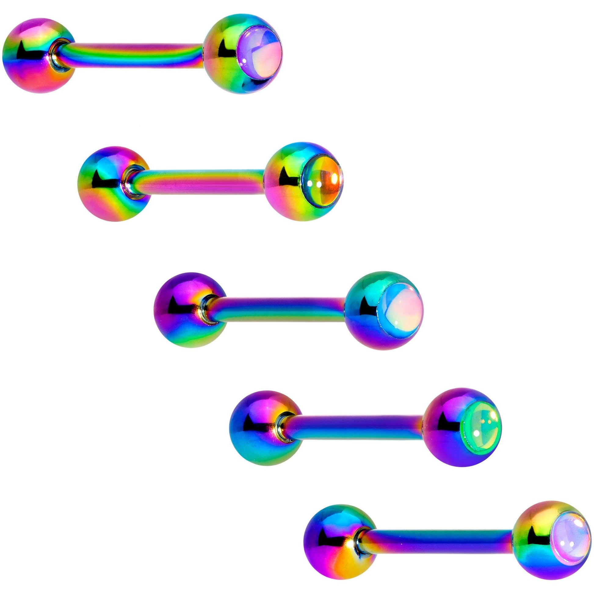 Aurora Gem Inlay Rainbow Color Barbell Tongue Ring Set of 5