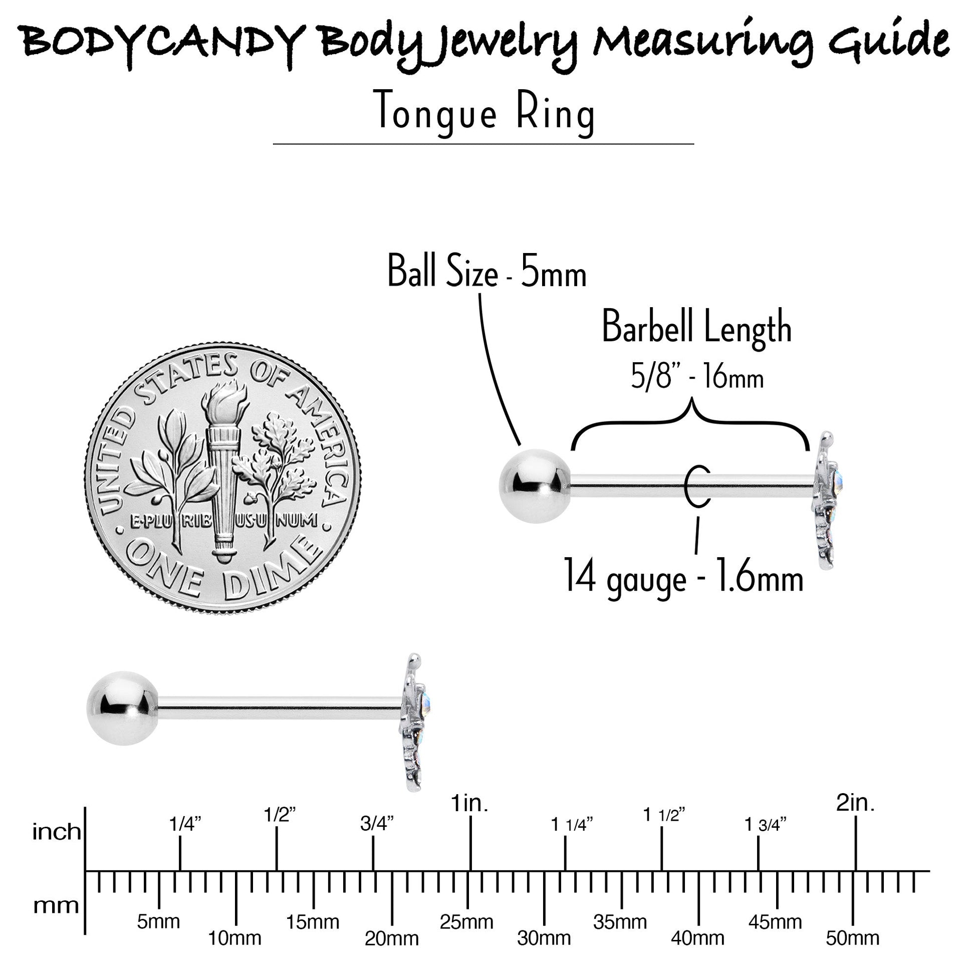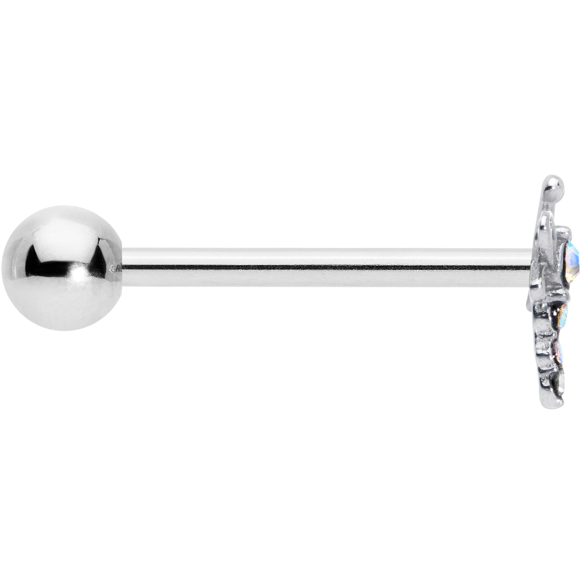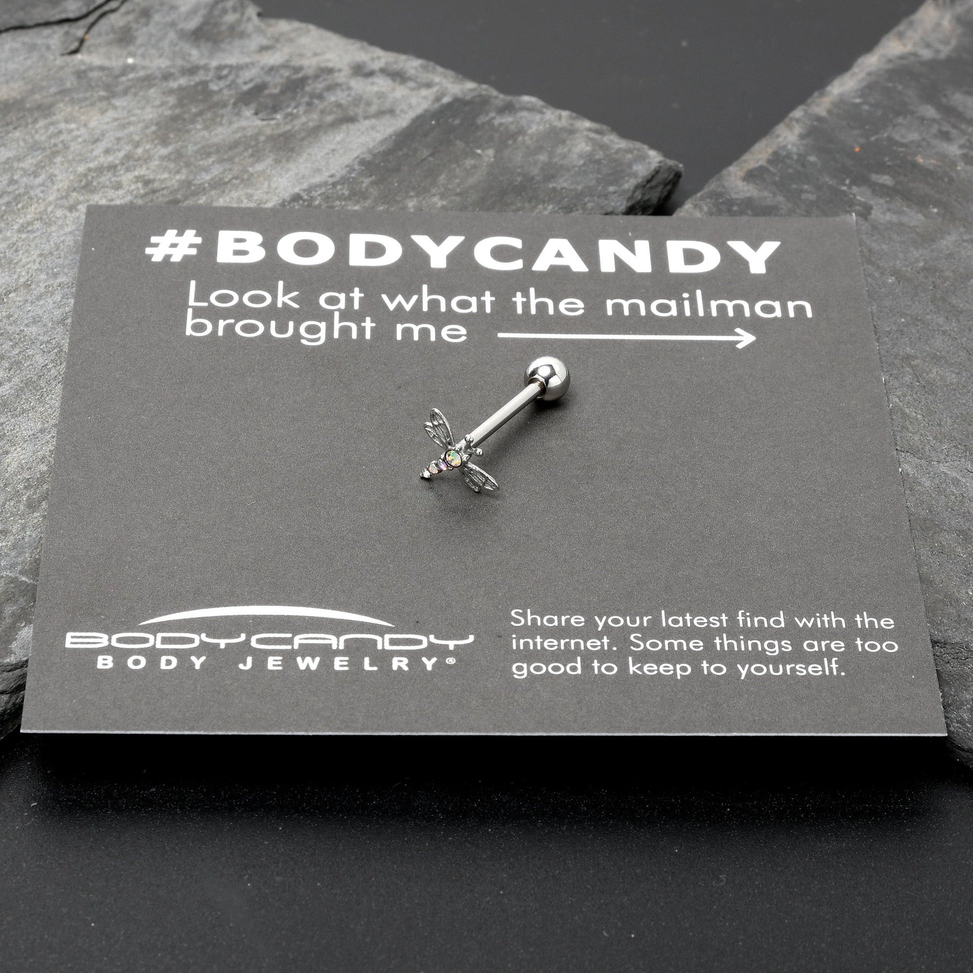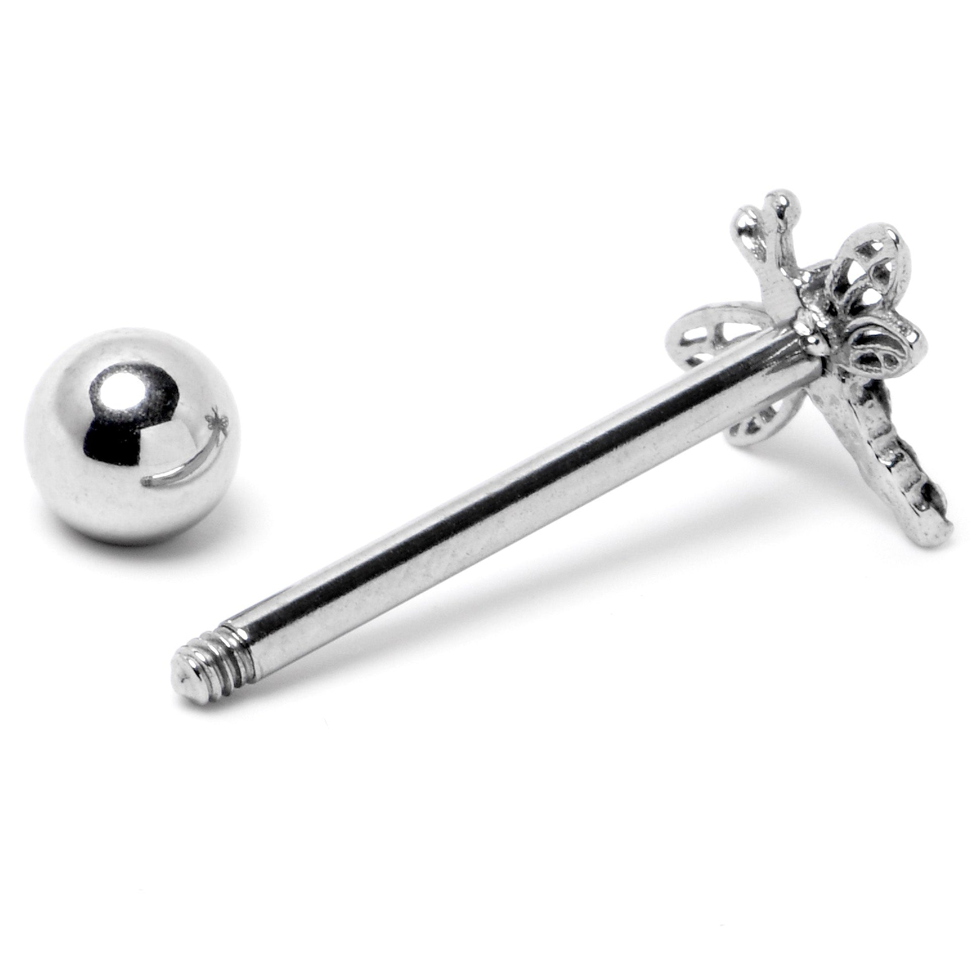 Dragonflies are constantly on the move so sometimes they just want to.....hang out. This 14 gauge tongue jewelry is made with a 5/8 inch 316L surgical grade stainless steel straight barbell with a 5mm bottom ball end. The top end is an ornate dragonfly charm, with elegantly openwork wings. The dragonflys body and center are set with aurora gems for a look that is both baroque and cohesive. You will want to hang out with this dragonfly tongue piercing ring all the time.Specifications