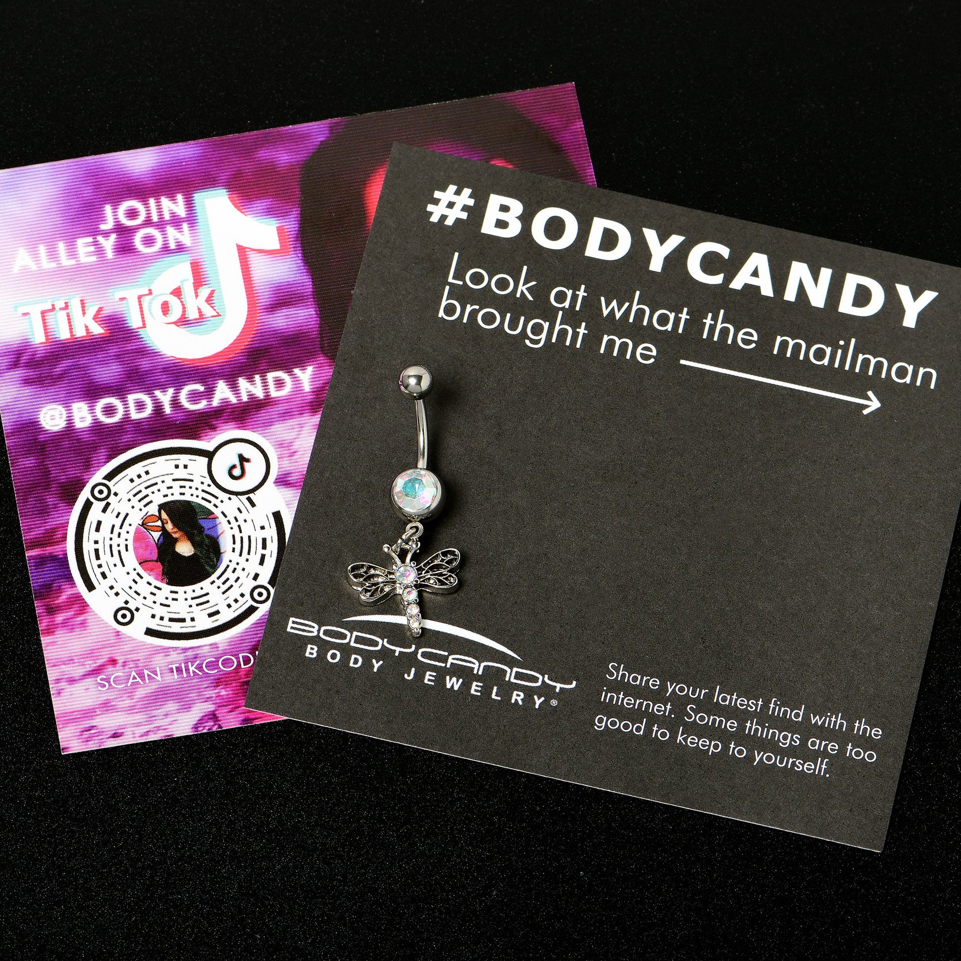 Dragonflies are constantly on the move so sometimes they just want to.....hang out. This 14 gauge navel ring is made with a 3/8" durable 316L surgical grade stainless steel curved barbell with a 5mm top ball end. The bottom ball end is 8mm and set with a large aurora gem. Dangling from beneath is an ornate dragonfly charm, with elegantly openwork wings. The dragonfly's body is and center are set with aurora gems for a look that's both baroque and cohesive. You'll want to hang out with this dragonfly all the time!Specifications
