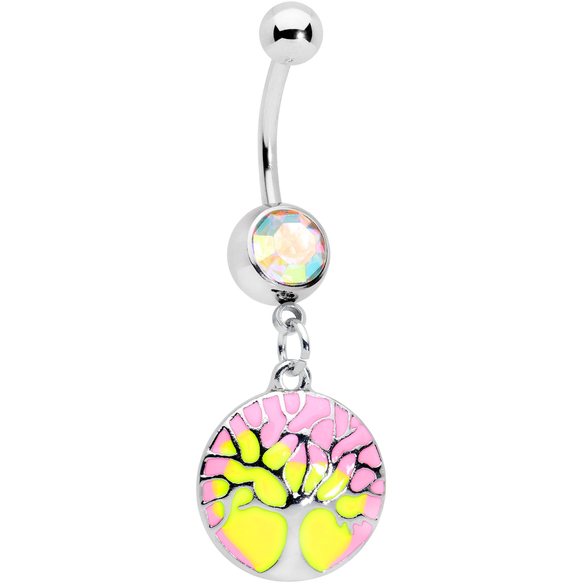 The sunset has taken on a softer look with this 14 gauge navel ring! It's made with a 3/8" durable 316L surgical grade stainless steel curved barbell with a 5mm top ball end. The bottom ball end is 8mm and set with a large aurora gem. Dangling beneath is a circular charm with pink and yellow colors in an ombre effect. It's embellished with a tree, which has zig-zagging branches that almost make for a crackly appearance. This is one tree you'll never want to trim on this pretty pastel belly piercing ring!Specifications