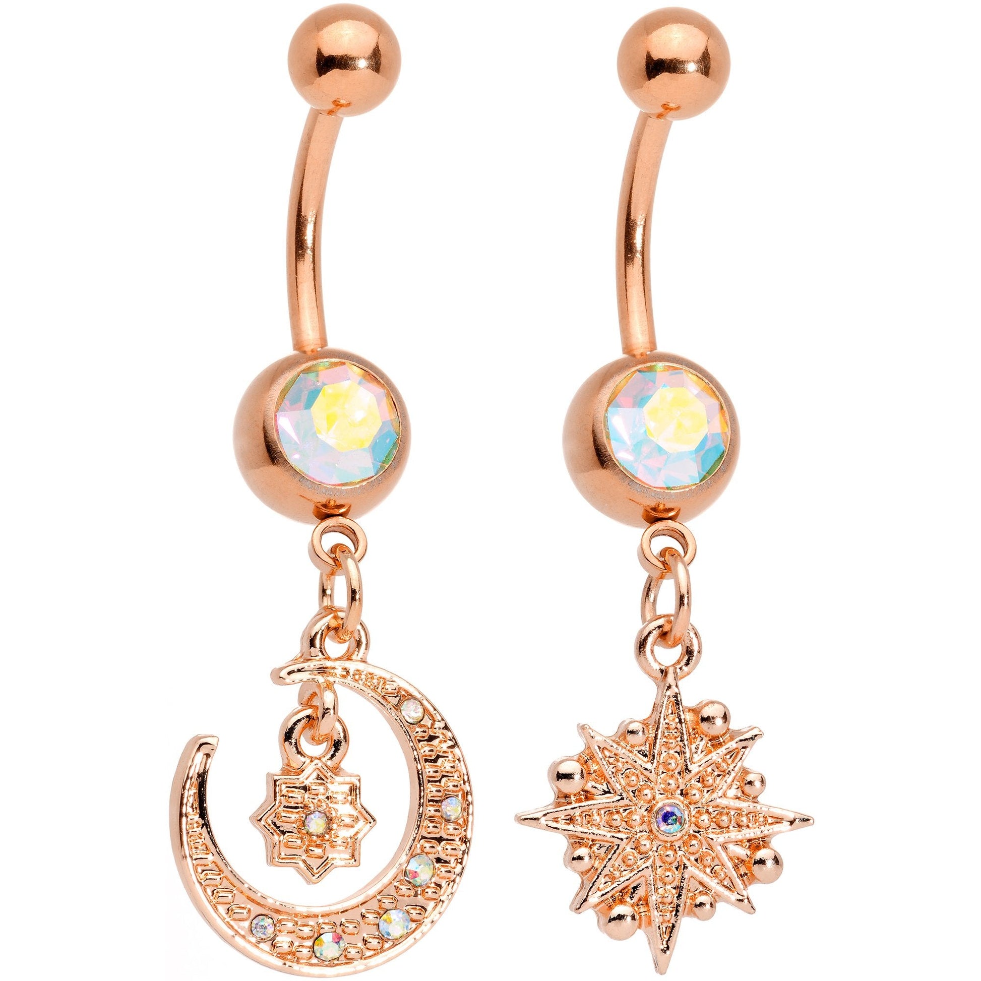 Aurora Gem Rose Gold Tone Celestial Star Moon Dangle Belly Ring Set