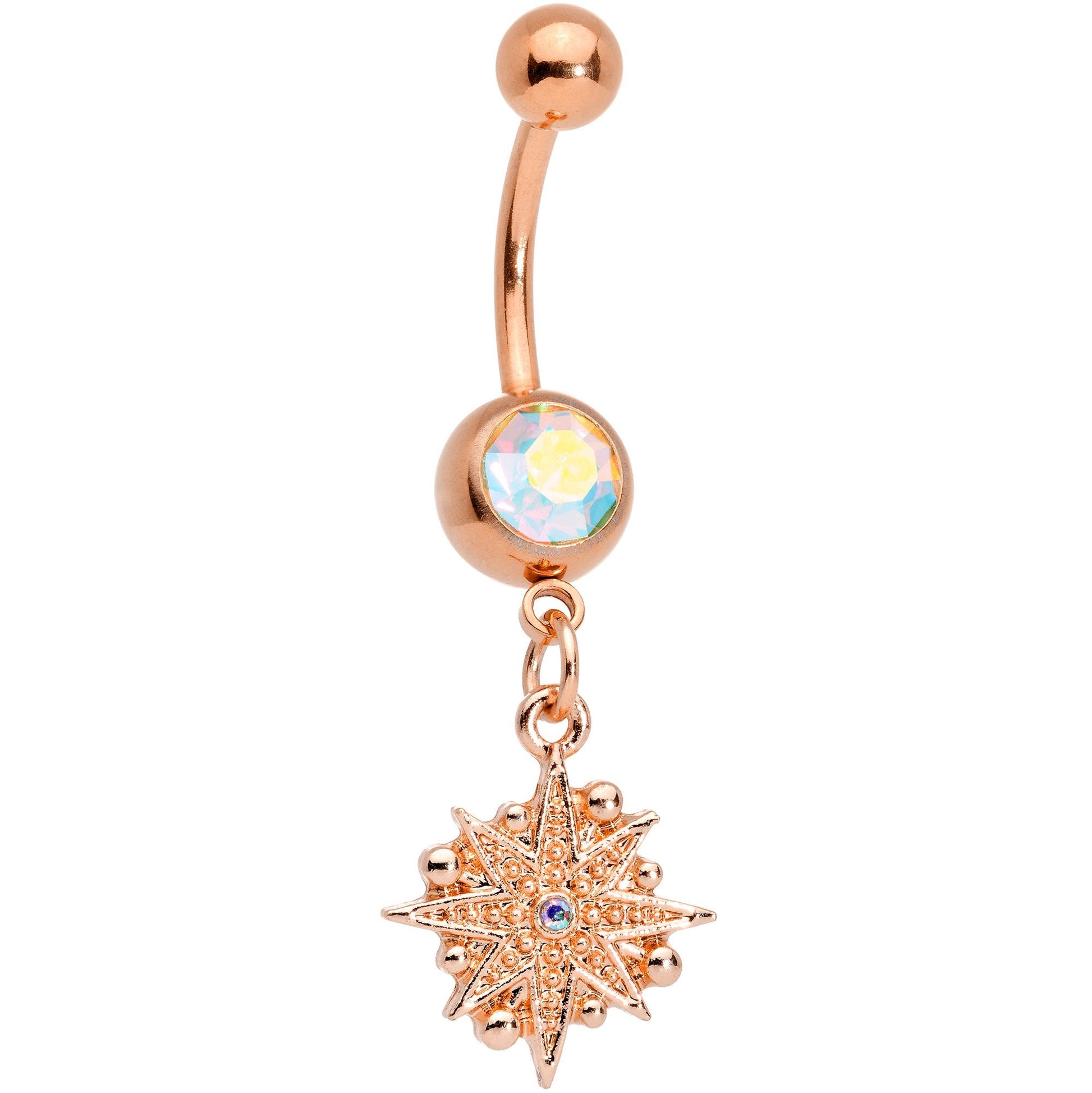 Even creatures of the night need some bling to beautify their body piercings! These 14 gauge navel piercings are made with 7/16" rose gold tone plated over 316L surgical grade stainless steel curved barbells and have 5mm top ball ends. They have 8mm bottom ball ends set with aurora gems. Dangling from the bottom of one is an eight-pointed star with textured detailing with an aurora gem set at its center. The other features a dangle shaped like a crescent moon with aurora gems running down its length. There is a tiny star hanging from the moon's top point, with an aurora gem at its center as well. Howl at the moon and let your navel jewelry be a star with this set of belly button rings! Sold as a set of two.