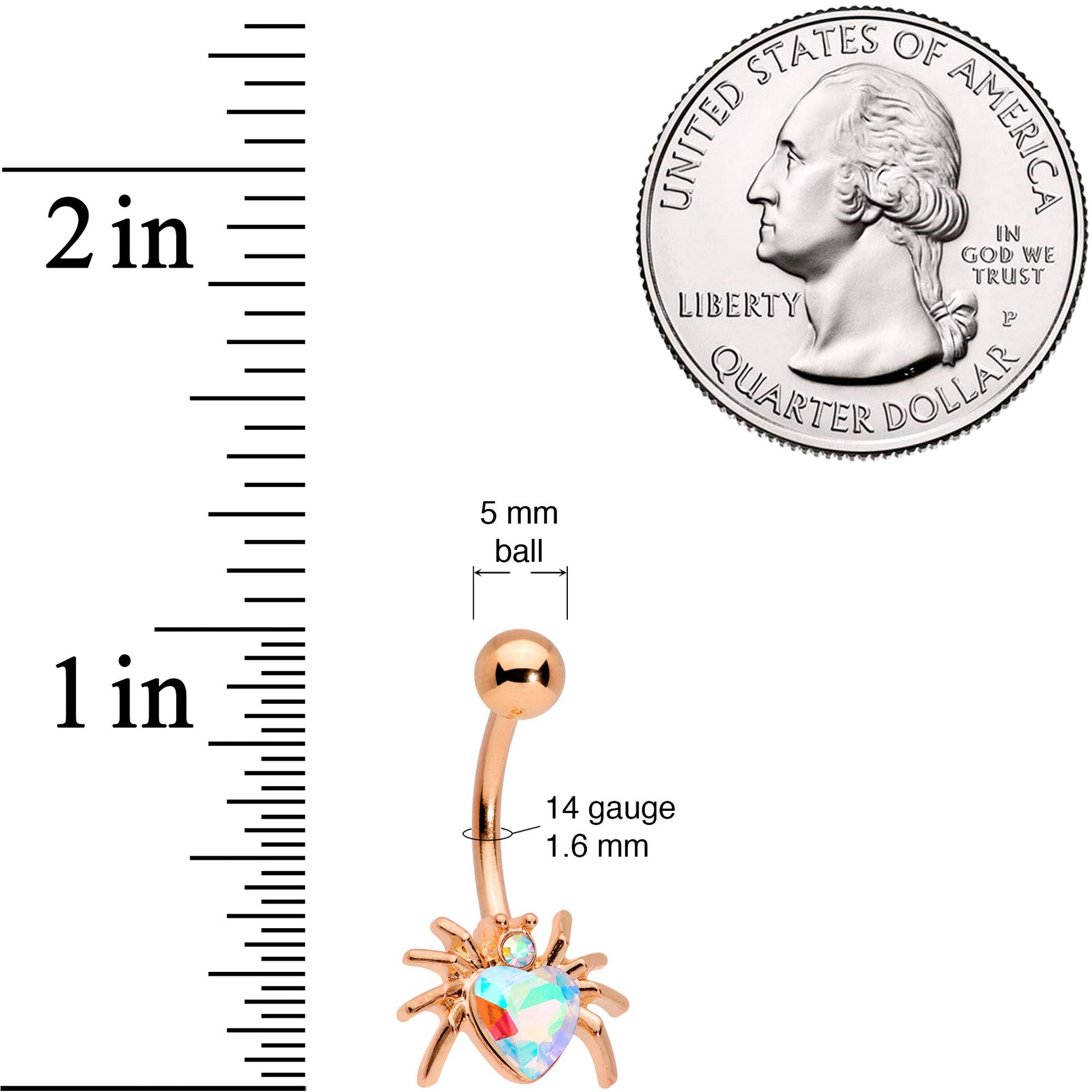 This spider body jewelry will give you the Halloween shivers.....but not shivers of fear! This 14 gauge navel ring is made with a 3/8" rose gold tone plated over 316L surgical grade stainless steel curved barbell and has a 5mm top ball end. The bottom end is a spider charm with the body made of Valentine's Day heart-shaped aurora gems and the head composed of a smaller aurora gem. So whether you cherish creepy crawlies or appreciate arachnids, this belly button ring is sure to snare you in its web!Specifications