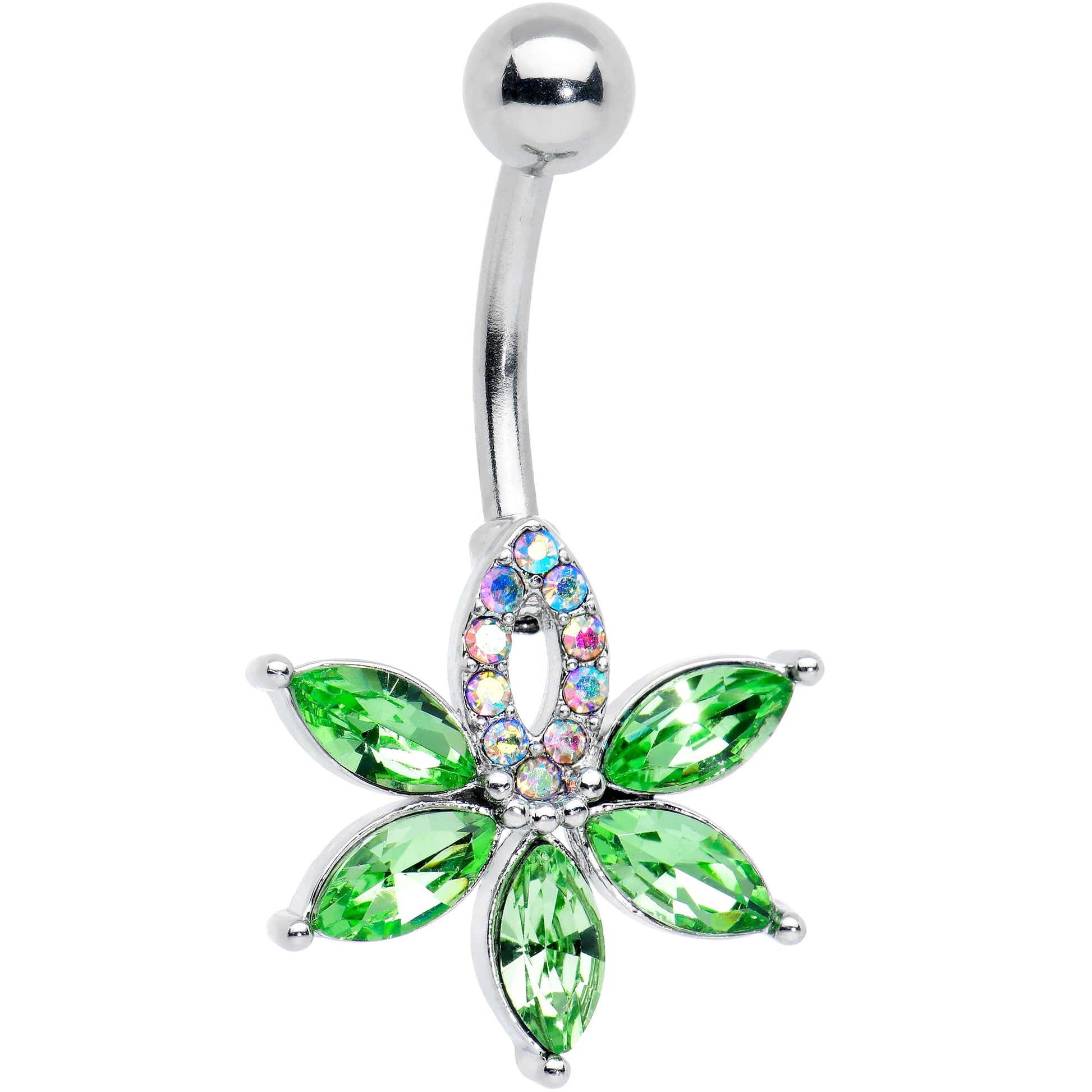 The pot leaf on this 14 gauge navel ring packs a powerful punch....of style! It's made with a 3/8" durable 316L surgical grade stainless steel curved barbell with a 5mm top ball end. The bottom end features a pot leaf charm, with five leaves composed of single green gems. The topmost leaf is set with tiny aurora gems for a colorful and eye-catching appearance. You'll be stoned on style when you're rocking this gorgeous, ganja-themed belly piercing ring!Specifications