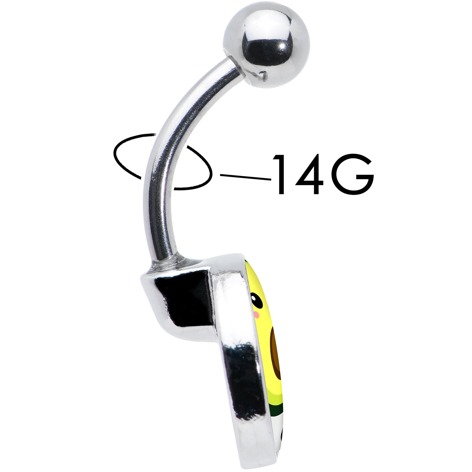Put the oh in avocado with these adorable 14 gauge navel rings. They're made with 7/16 inch durable 316L surgical grade stainless steel curved barbells with 5mm top ball ends. Both feature avocado charms on white backgrounds, with sweetly wide eyed expressions. One still has a seed, while one does not. Whether you want to share with a friend or keep them all to yourself, these avocados are sure to make you smile. Sold as a set of two.